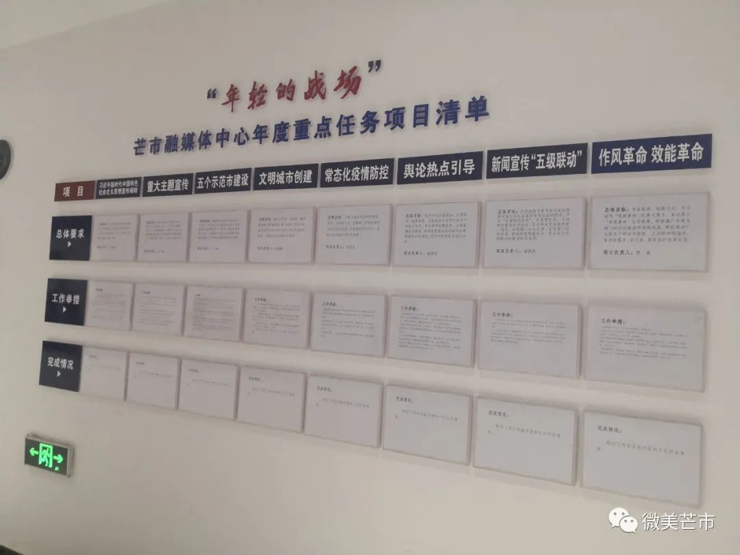 在芒市融媒体中心的走廊上,“年度重点任务项目清单”的公示栏格外醒目。经过广泛征求意见和反复研究,中心紧紧围绕市委、市政府中心工作最终确定了“精心组织重大主题宣传”“深入开展芒市‘五个示范市’建设宣传”“大力推动全国文明城市创建宣传”“持续开展常态化疫情防控宣传”“稳妥做好舆论热点引导”“着力营造‘作风革命 效能革命’工作氛围”“努力实现新闻宣传‘五级联动’”8个重点宣传项目,开列出60条具体措施清单,每一个项目均明确工作目标、工作举措、完成时限,并由8名党员业务骨干担任项目负责人,实行“一周一通报、一月一亮晒”工作机制,真正实现了工作项目化、项目清单化、清单具体化。