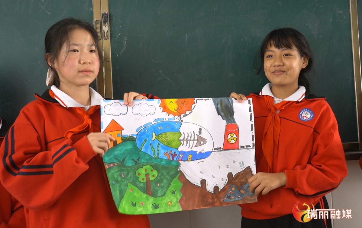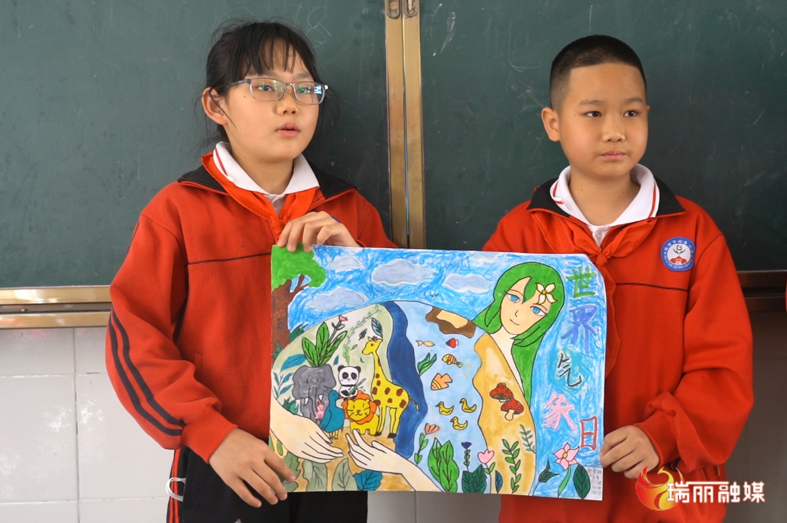“ 今天,我们小组画的主题是“世界气象日”,这是‘环境女神’拥抱着地球......”姐告国门小学四年级73班的同学们正一一介绍着自己画作。