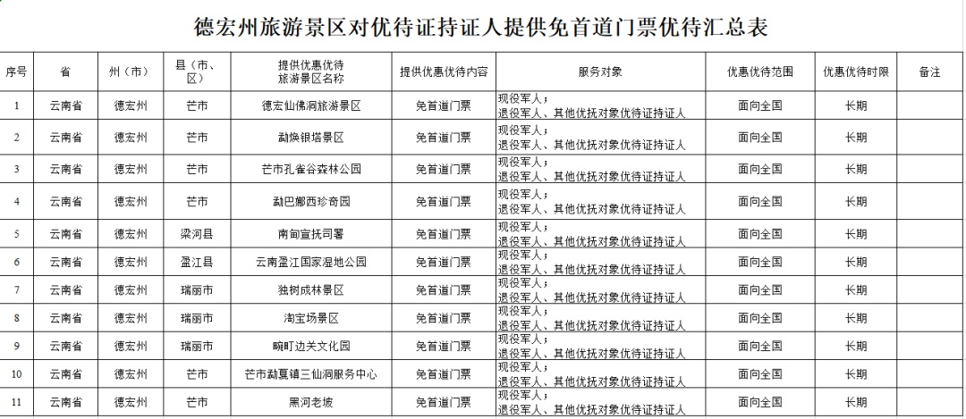 德宏州行政区域内的11个旅游景区(详情见下表),对优待证持证人提供免首道门票优待(不包括首道门票外的其他收费项目)。