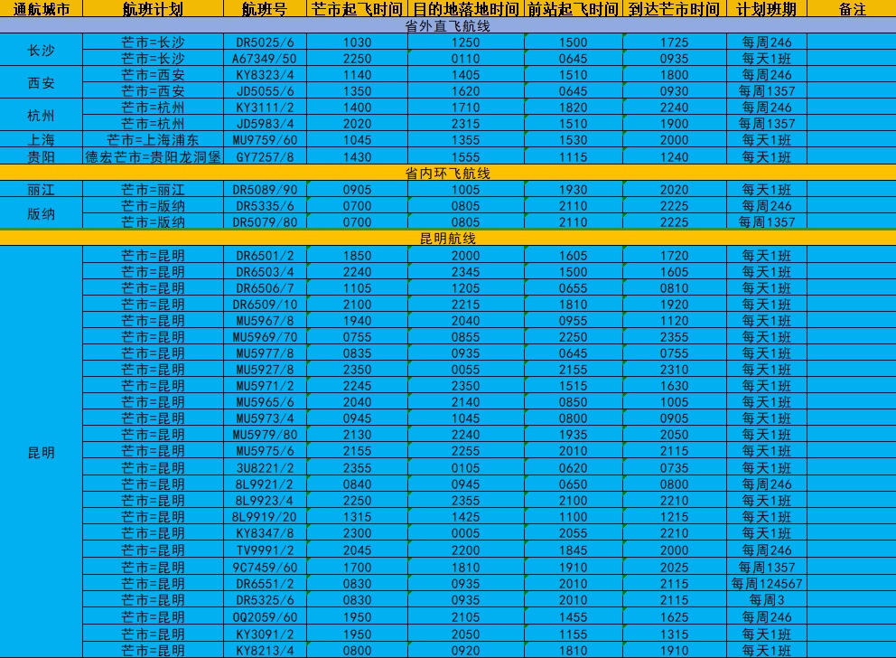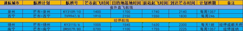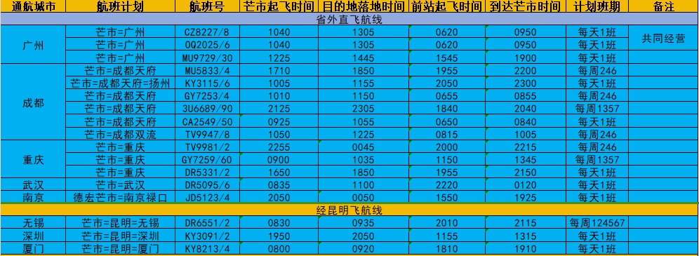 芒市经停昆明至深圳、厦门、无锡、惠州、常州;经停版纳至南宁;经停成都天府至扬州等7条经停航线;