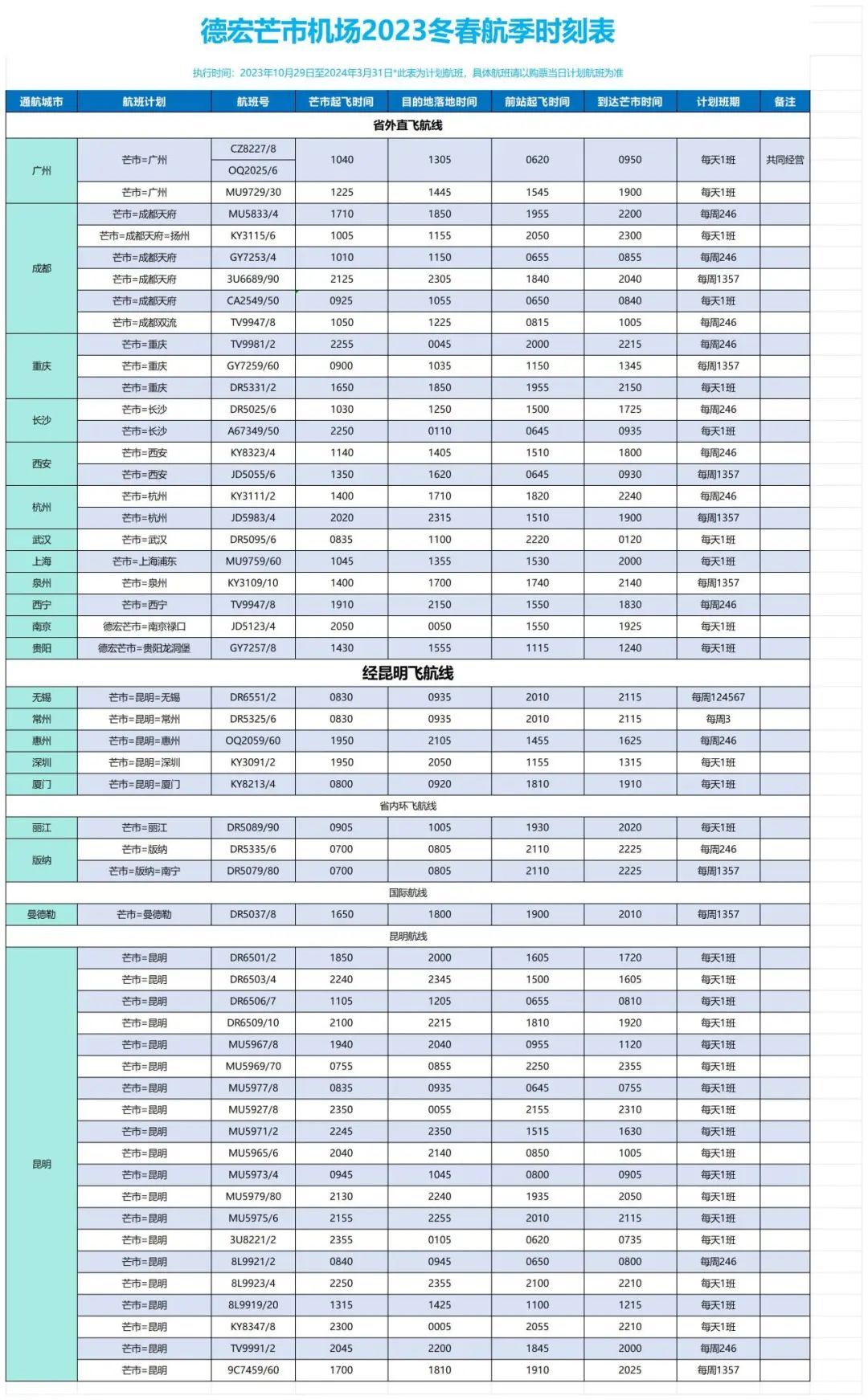 2023年10月29日至2024年3月30日,德宏芒市机场将执行冬春航季航班计划。
