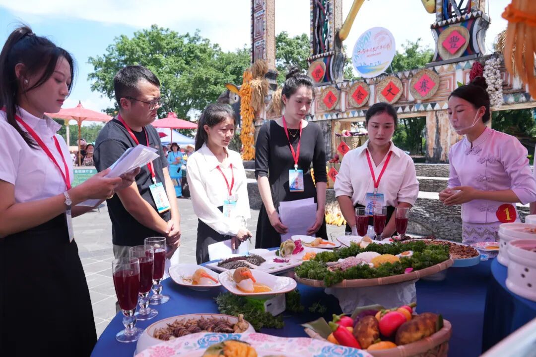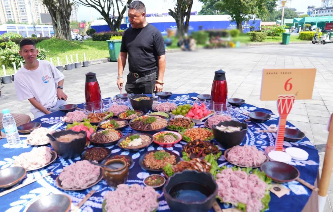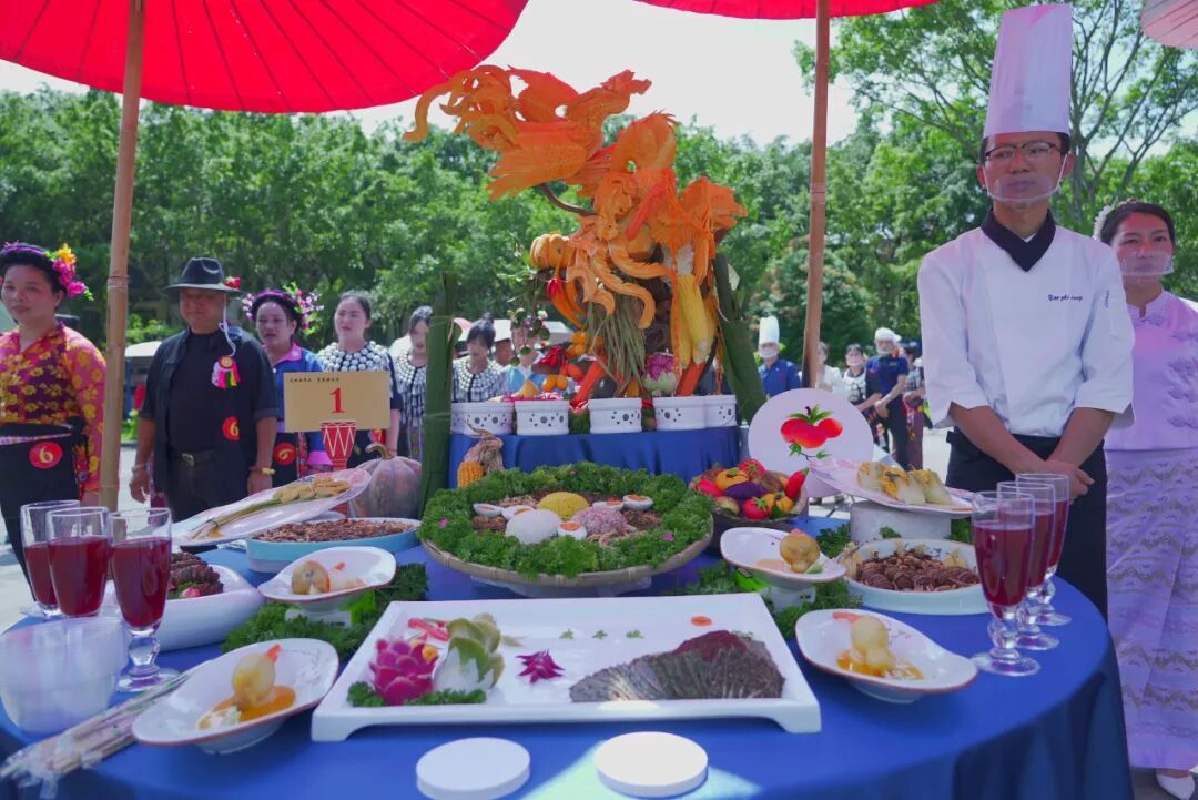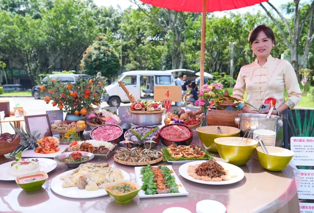 现场,来自芒市各乡镇(街道)、农场社区推荐的餐饮商户、农家菜馆,傣族、景颇族、德昂族等民族特色美食传承人,民间烹饪爱好者,以及德宏职业学院、芒市职业教育中心餐饮专业的师生团队带着对土地的感恩、对美食的热忱,用遮放贡米、本地畜禽、热带果蔬等“芒市丰收好料”一一呈现传统美味,更有创新农家菜、丰收主题果饮与甜品登台亮相。