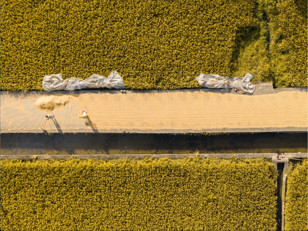 丰收的喜悦,还藏在盈江人特有的秋日仪式里。谷粒收回家后,家家户户会开始“晒丰收”。院子里的晒场、田野的路成为了秋收的展示台,他们将谷粒均匀摊开,阳光晒得谷粒发烫,也把日子晒得暖洋洋。傍晚收谷时,木耙子在晒谷垫上划出规整的纹路,谷粒顺着纹路聚成小山。夕阳西下,谷子归仓,满满的粮仓让农民“手中有粮,心中不慌”。谷子一收,将碾出的新米煮成一锅喷香的白米饭,加上几个小菜,约上几个好友小聚,便是盈江人最朴素的丰收庆典。