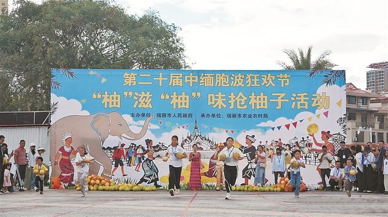 10月2日下午,第二十届中缅胞波狂欢节“柚”滋“柚”味抢柚子活动在瑞丽江边广场热闹举行。