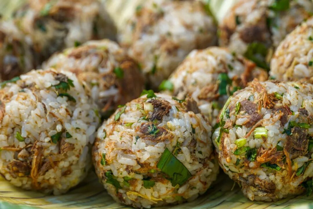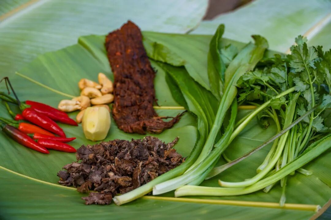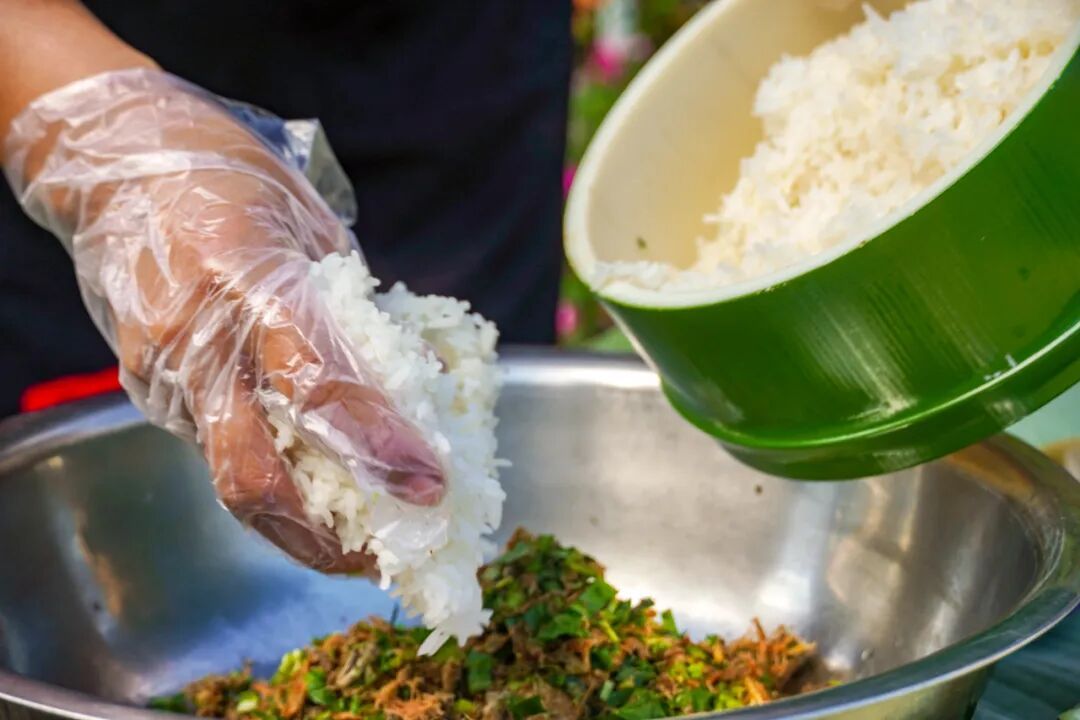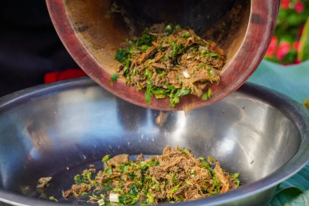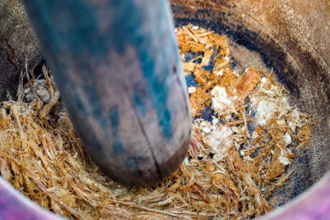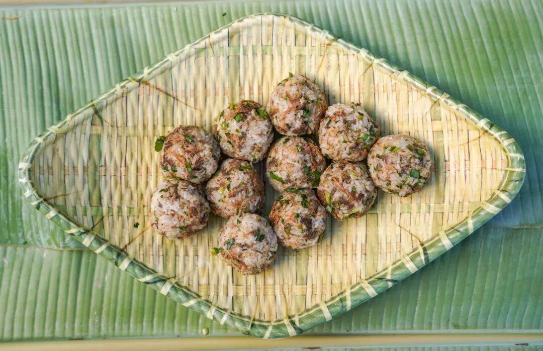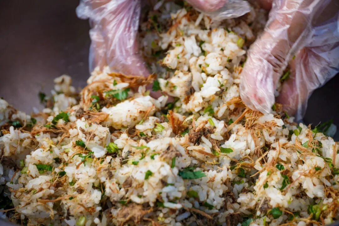 饭团裹着舂碎的牛干巴、缅芫荽、腰果、八担柴等。要先将牛肉干巴烤熟,再将牛干巴、大蒜、腰果、八担柴、缅芫荽也放入舂桶里一起舂碎。将米饭加入到舂好的配料中,洒上盐、味精揉搓入味。