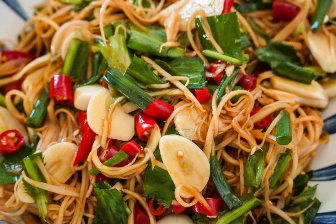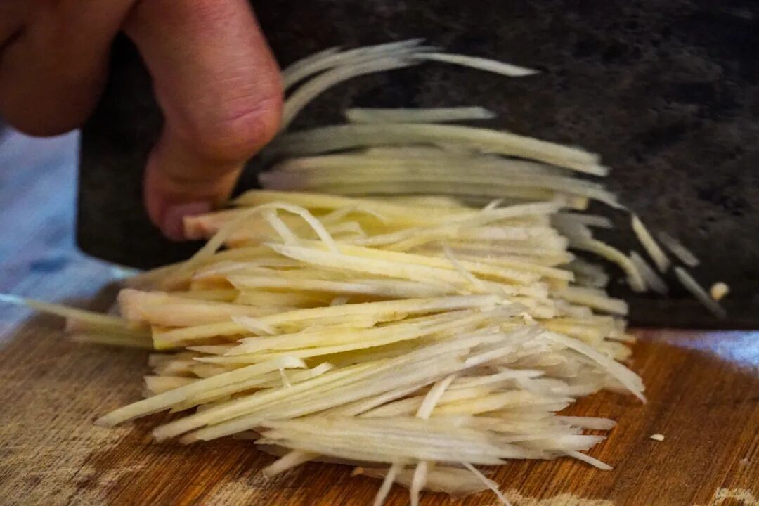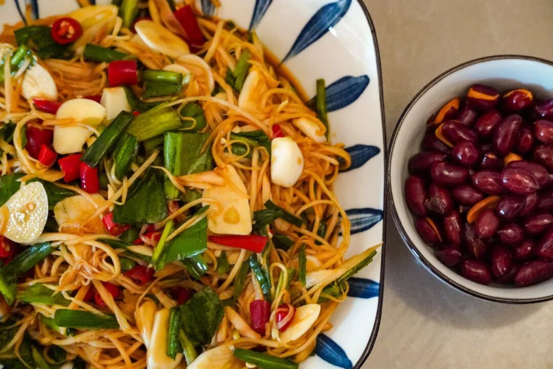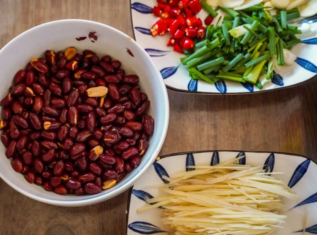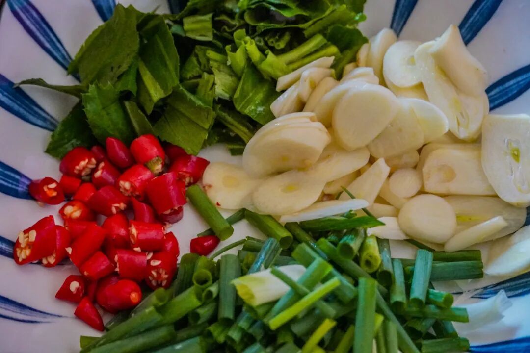 它其实是德宏的一道特色凉拌菜。主要原料是生姜和小米辣,生姜切丝,辣椒、葱、大蒜、缅芫荽切段,再加入盐、味精、醋、酱油。