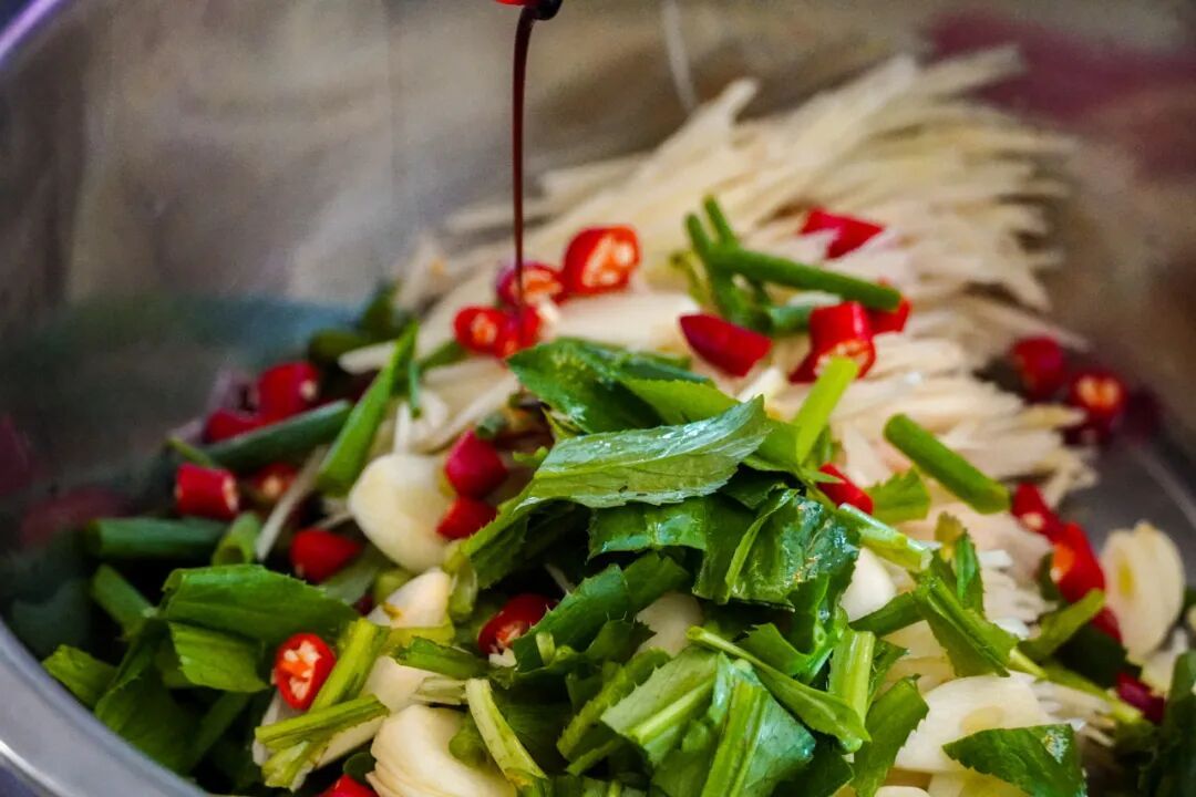 最画龙点睛的一步来了——拿起德宏特有的“涮涮辣”,在蘸水里轻轻涮几下即可。各种味道碰撞融合,瞬间明白为什么叫“鬼火绿”!
