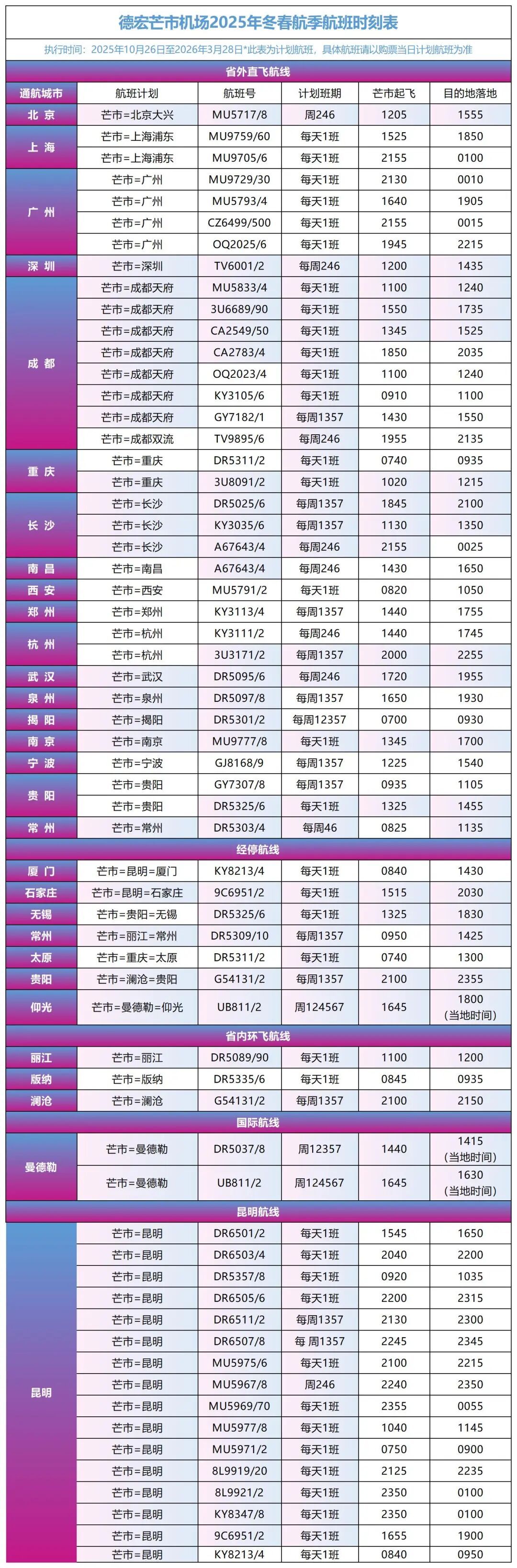 原标题:收藏丨10月26日起,德宏芒市机场执行冬春航季航班计划!