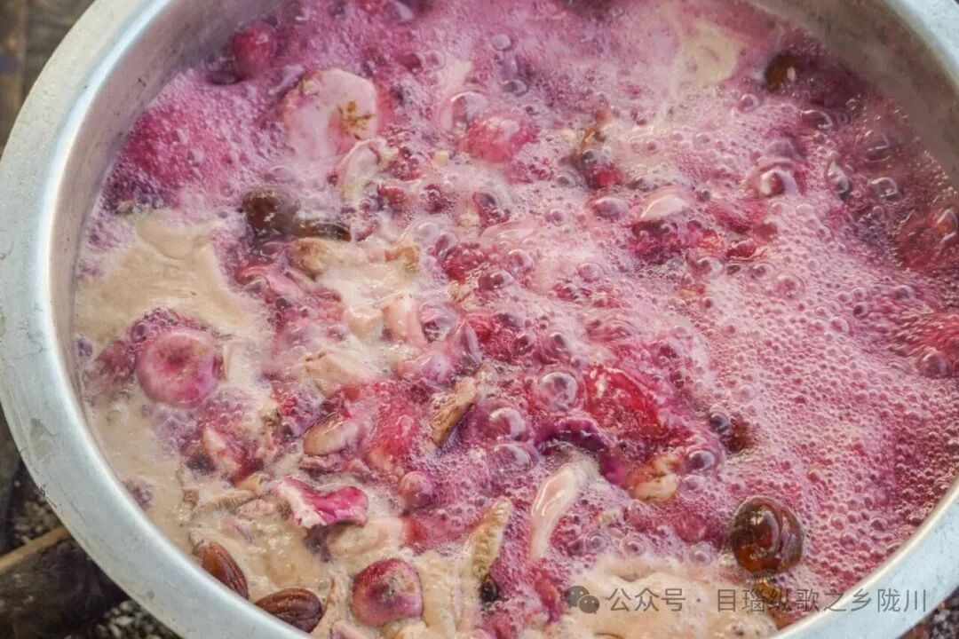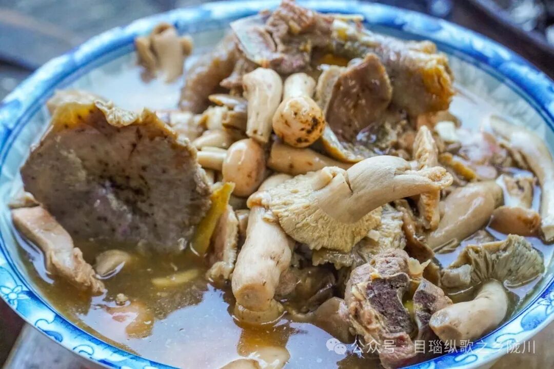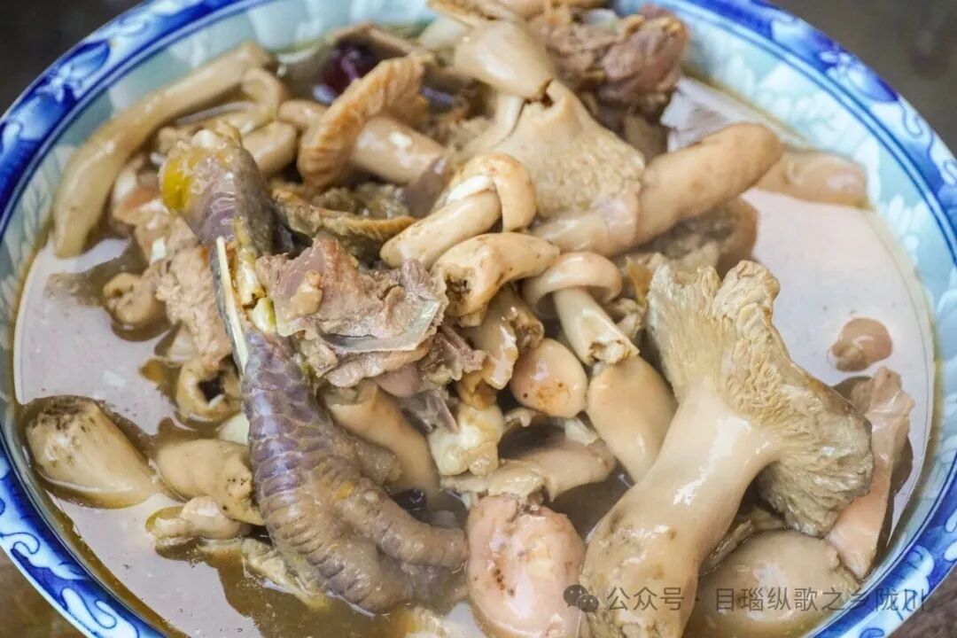 红菌本身口感爽滑,肉质肥厚,咬下去会有轻微的脆感,随后是满口的鲜香。红菌煮鸡的汤是灵魂所在,汤汁浓郁微红,入口鲜甜醇厚,有菌子特有的山林气息和鸡肉的浓郁香味。喝上一口,仿佛能感受到德宏雨林的清新与生机。