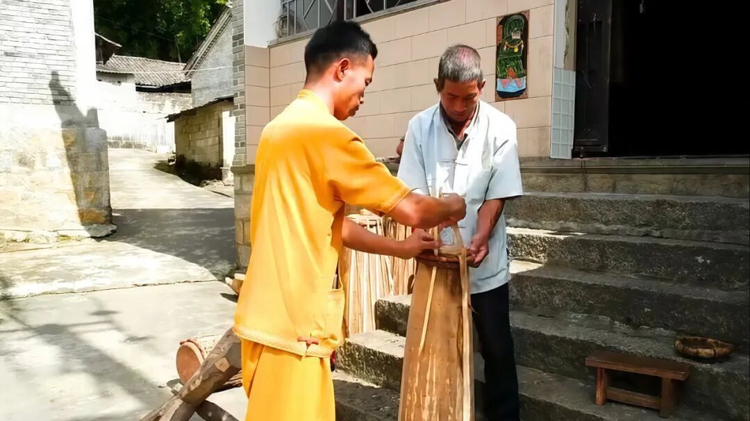 一旁的年轻学徒帕波宽专注地协助着,汗水浸透衣襟。他轻声说:“做鼓不仅是手艺,更是责任。每一面鼓都有自己的灵魂,我们要让它在未来继续响下去。”夕阳下,老人与学徒的身影与鼓身重叠,仿佛时光的注脚。“光邦”鼓是自然与匠心的完美结合,这种以自然为尺度的智慧,正是非遗活态传承的根基。