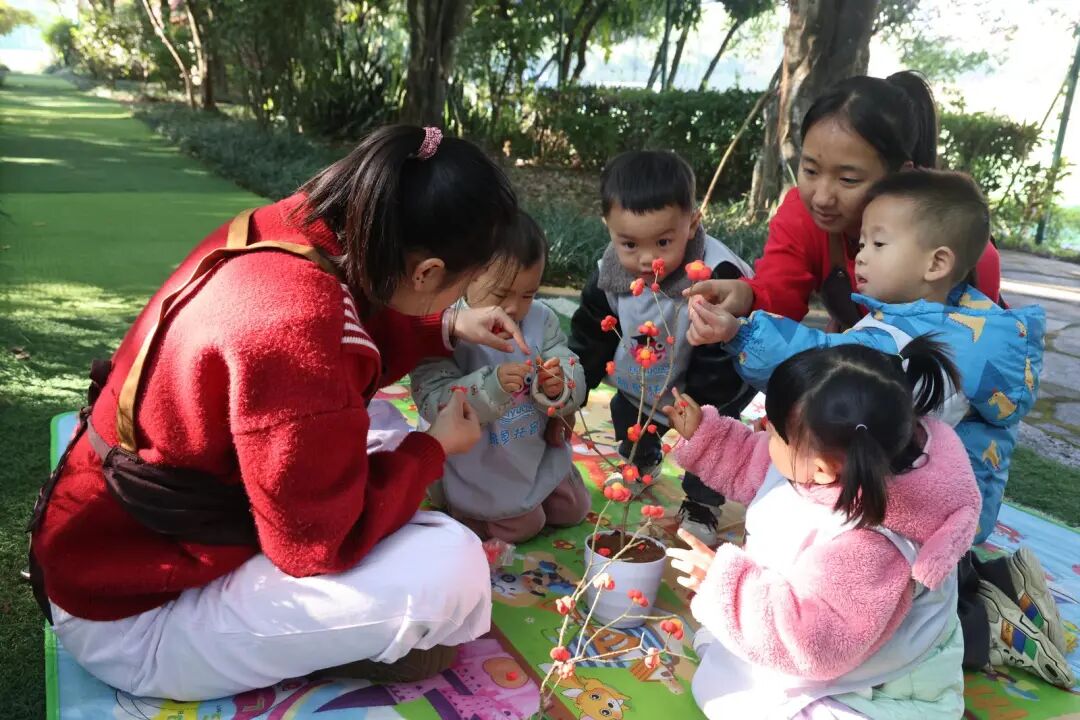 交谈间,记者跟随李芹美来到户外自然探索区,眼前的景象鲜活而暖心:孩子们或指着树上叽叽喳喳的小鸟兴奋地拍手,或蹲在地上观察在草地里爬行的蚂蚁,或小心翼翼地将看到的花朵形状拓印在树枝上,还有一群孩子正围着刚发现的蜻蜓轻声交流。在李芹美老师的引导下,孩子们伸出小手触摸感知蜻蜓的轮廓,而后缓缓挥手和蜻蜓说“再见”。他们眼中满是纯真与不舍,那份对自然生灵的珍视与好奇,正是鲱鱼托育园“自然养育”理念下童心与万物联结的美好写照。