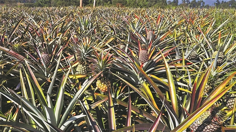 棒丙村是远近闻名的“菠萝村”,有着60余年的种植历史,目前全村种植面积超过3500亩,而冬菠萝的推广种植始于10多年前。不同季节的菠萝在施肥管理、催花时间上也不同,棒丙村通过多年的实践摸索,现已可精准调控菠萝的生长周期和开花时间,有效突破季节限制,促进冬季菠萝的生长成熟,实现抢“鲜”产出。如今,棒丙村一年之中除了6月不收果,其余11个月基本都有果收,品质最好的菠萝多采收于3至5月间,此时价格也最高。“口感上,冬季菠萝虽比夏季菠萝略酸,但这种酸甜适中,吃起来非常爽口、风味更足。今年全村冬季菠萝亩产量预计达2.5吨至3吨。”种植户朗三旺介绍。
