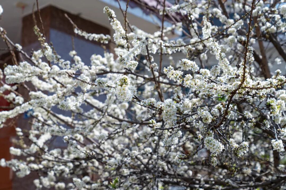 没有雪的映衬,素白花瓣更显纯粹洁净,五片薄瓣轻舒,裹着嫩黄的花蕊,一簇簇缀在疏朗枝丫间,像撒了一身碎月光。