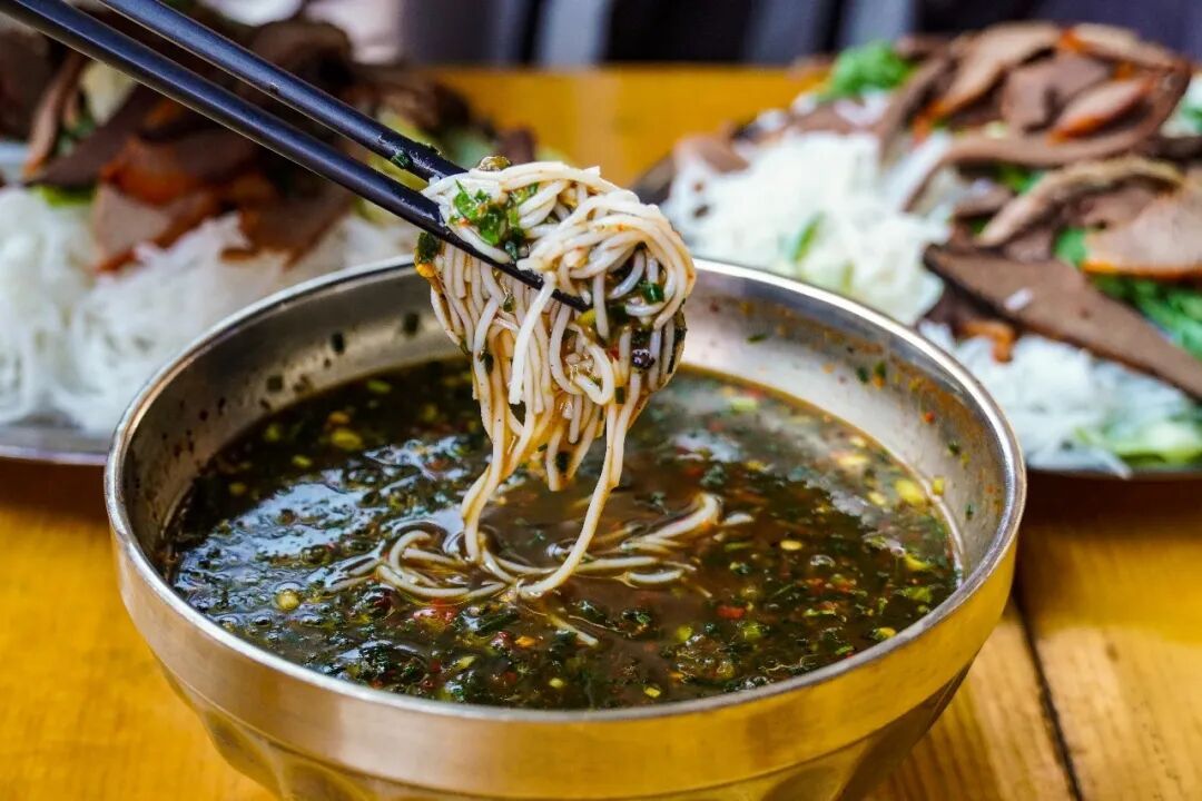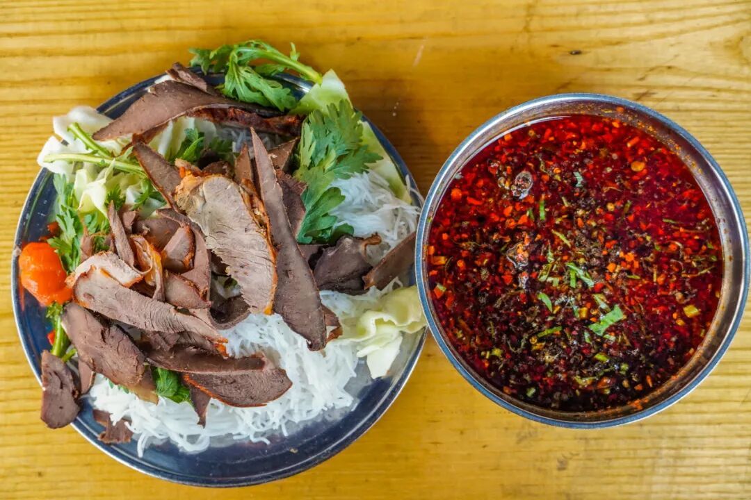 苦撒,用牛苦肠熬制苦水,性凉降火,是一剂清凉良方。苦水便是苦撒的灵魂,与生熟牛肉、牛肚、牛肝及茼蒿、包白菜等配菜混合,入口苦香交织,随后回甘,妙不可言。
