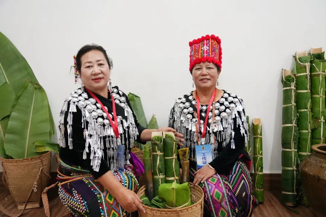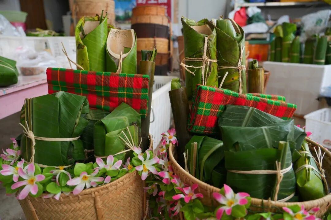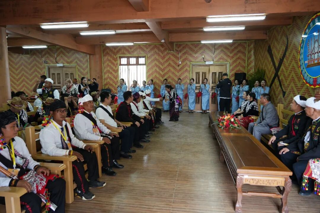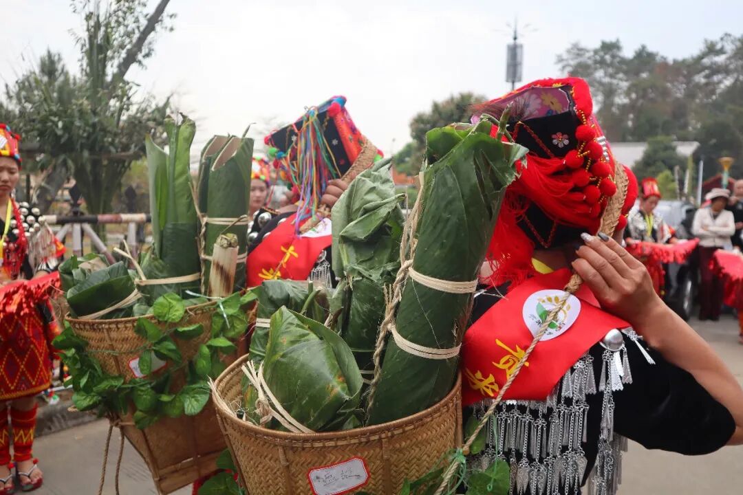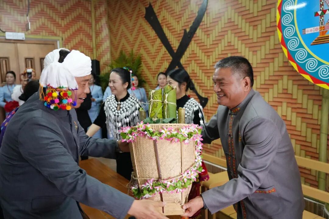 报到现场,身着传统盛装的景颇群众列队相迎,木代房内迎宾曲婉转回荡。各祝贺团依次献上精心备置的景颇礼篮,藤编礼篮古朴雅致,篮内物品规整有序:芭蕉叶包裹的糯米饭团象征团结同心,水酒与米酒寓意和睦美满,熟鸡蛋寄托平安健康,竹筒烧肉、鸡肉承载丰收吉庆,每一件信物都饱含景颇族对宾客的尊崇与对节庆圆满的祈愿。礼篮以竹篾规范捆扎,绳结相连相交,寓意各族人民心连心、手牵手,共筑民族团结大家庭。