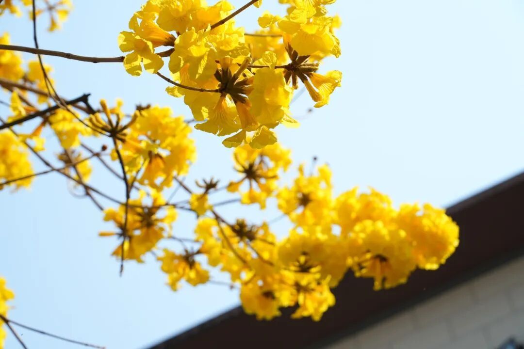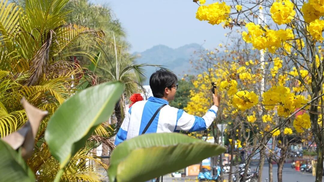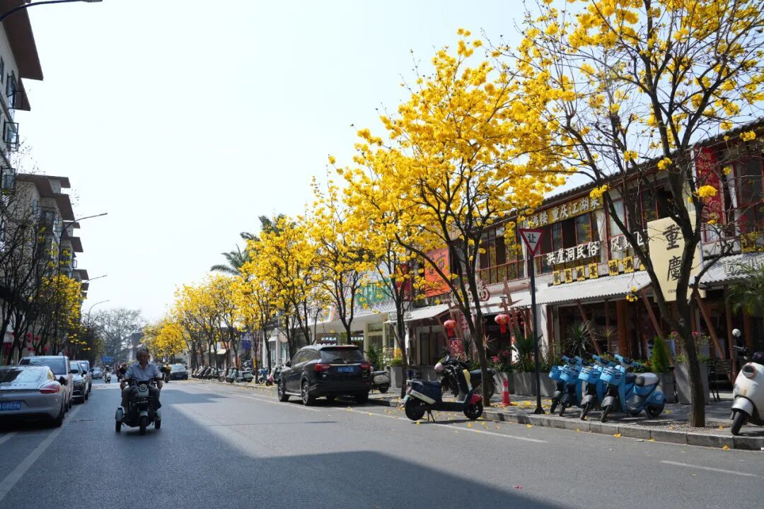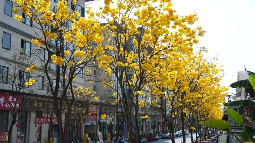 黄花风铃木花期集中在每年2至4月,单株花期仅10至15天,堪称“春日限定”美景。眼下正是芒市黄花风铃木的最佳观赏期,街头巷尾的金黄与蓝天相映,不管是散步打卡还是拍照留影,都超合适,赶紧约上小伙伴去邂逅这份美好吧!