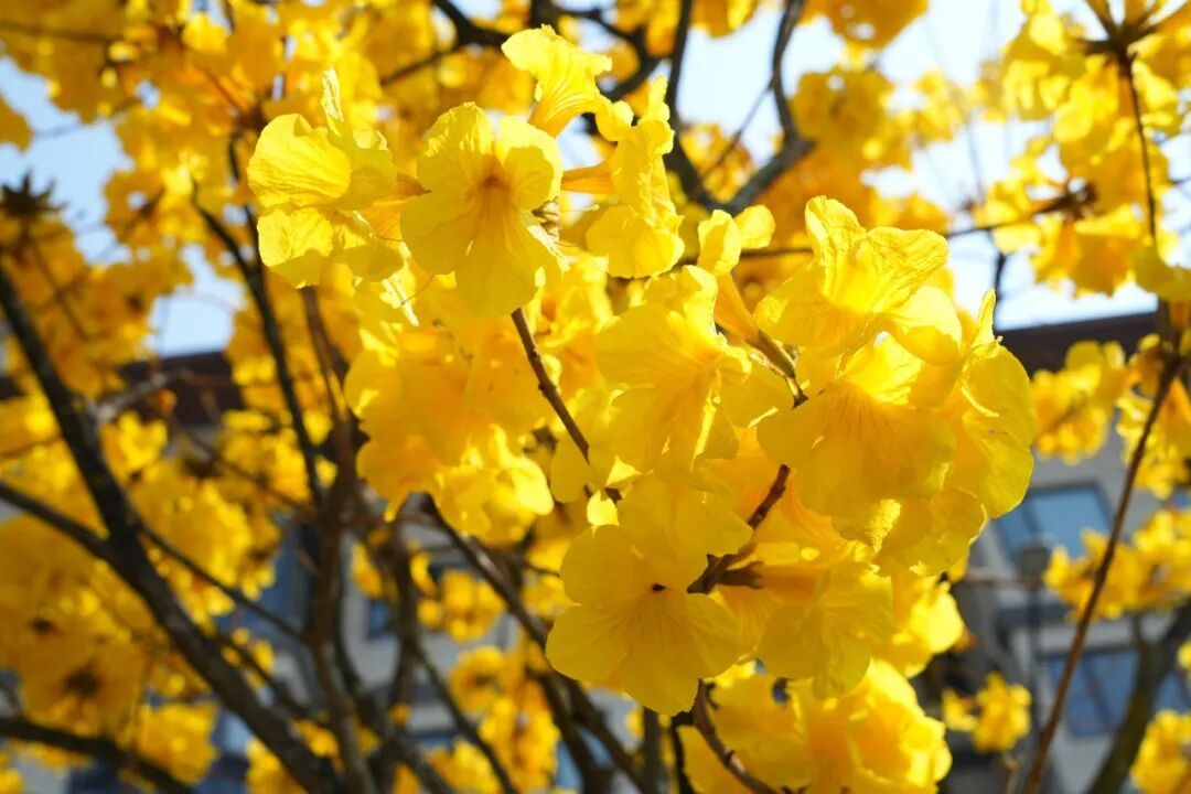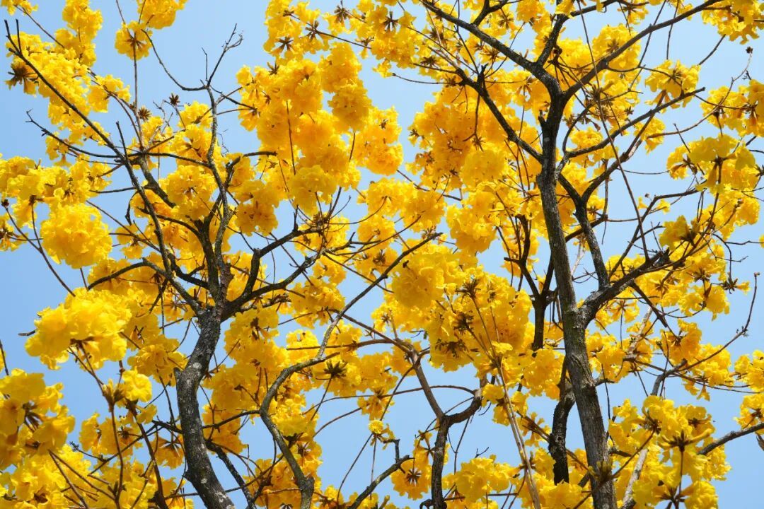 黄花风铃木为紫葳科风铃木属落叶小乔木,是巴西国花、委内瑞拉国树。它最特别的地方就是先花后叶,冬季落叶后于早春集中绽放,盛花期通体金黄,几乎无叶,视觉效果震撼。其花朵呈漏斗形、风铃状,金黄色花瓣五裂且边缘微皱,数十朵聚成圆锥花序,微风轻拂,花枝摇曳,宛如一串串金色风铃随风作响,偶有花瓣轻轻飘落,漫步其间宛若置身童话世界。