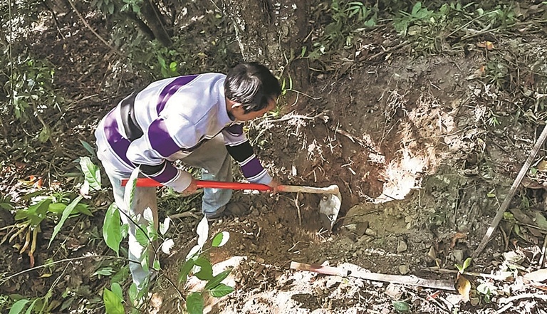 循着熟悉的脚步声,跟着当地村民尹加辉带上小锄头、拎起竹篮,踩着沾着晨露的田埂往山野深处走,抵达山药生长区。眼前是一片爬满藤蔓的坡地,翠绿的藤蔓顺着地面蔓延,在薄雾中若隐若现。“找山药得先看藤蔓,顺着藤蔓往下挖,动作要轻,不然容易把山药挖断。”尹加辉蹲下身,手指着藤蔓的根部,耐心地讲解着寻找野山药的技巧。他的声音温和而有力量,混着山间的鸟鸣,成了晨雾里最动听的旋律。当第一根带着湿润泥土、形态饱满的野生山药完整地露出全貌时,晨雾似乎都柔和了几分。褐色的外皮裹着新鲜的泥土,沉甸甸地握在手里,带着山野的温度。那一刻,所有的专注都有了回响,那种亲手寻得自然馈赠的成就感,在心底缓缓漫开。
