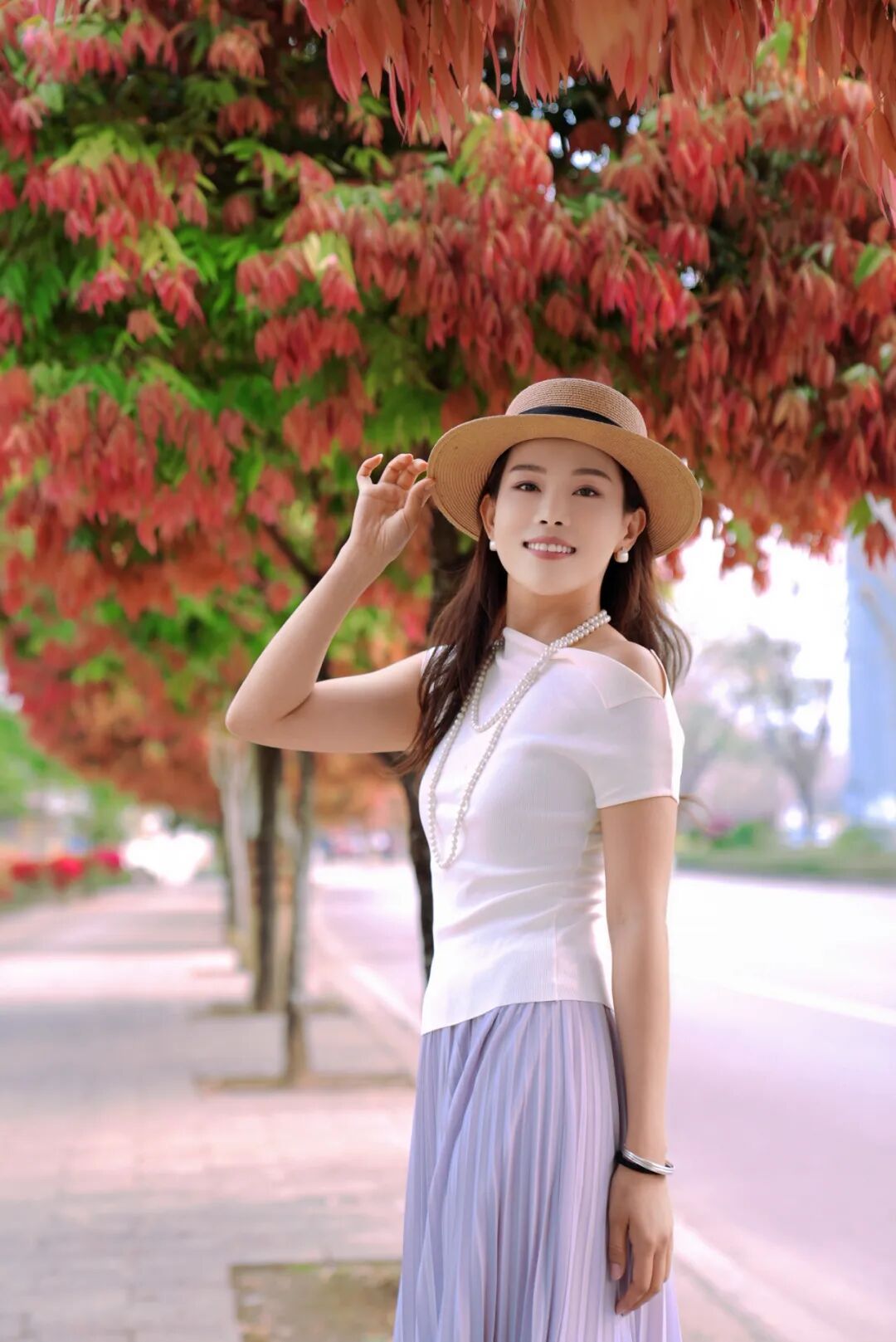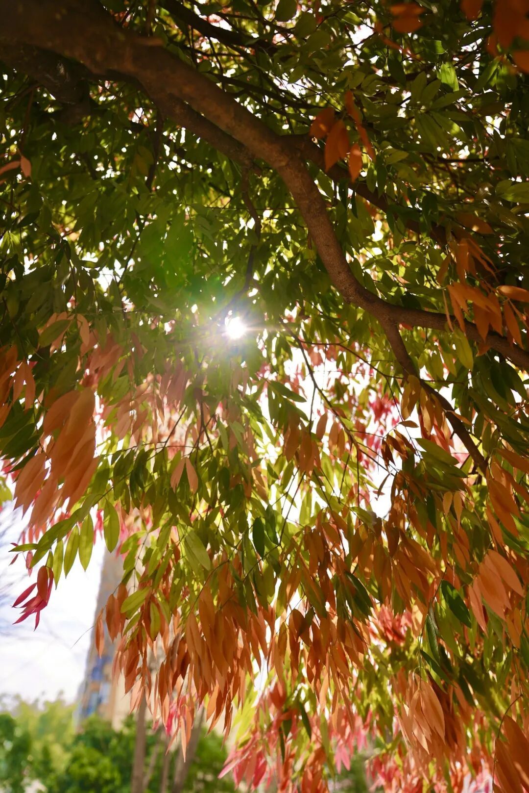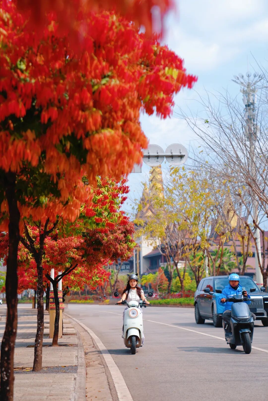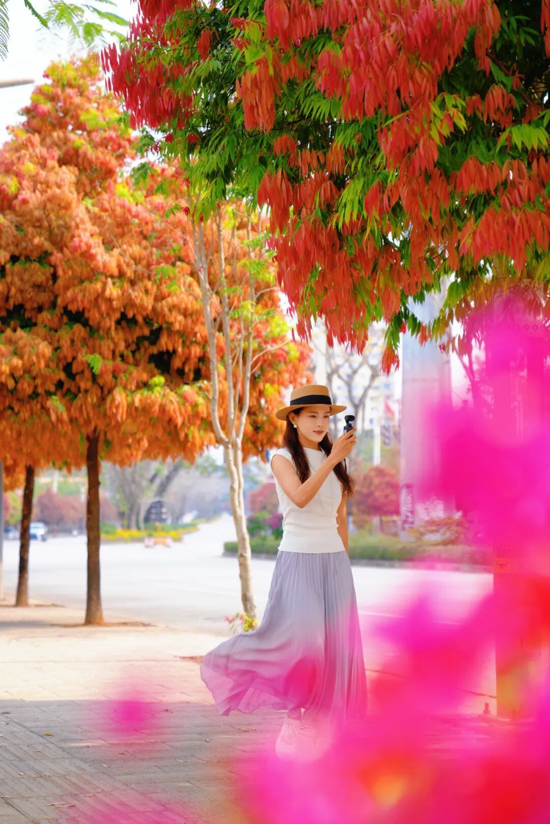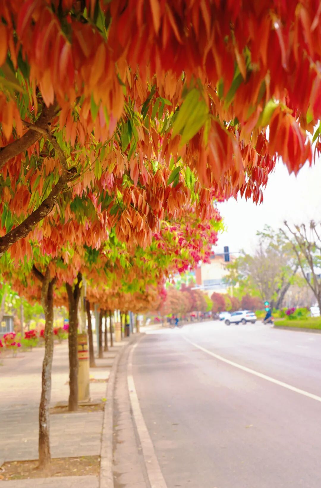 此时的行道树上,嫩叶绯红似霞,白花清雅飘香,层层叠叠的红与白交织,把整条路晕染成浪漫画卷,成为芒市独有的“醉美红叶大道”。行走其间,抬头是满目绯红,低头是花香萦绕,一步一景皆是治愈。