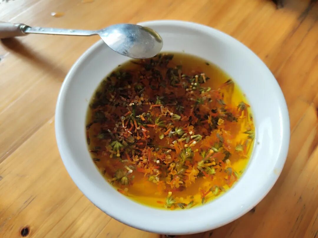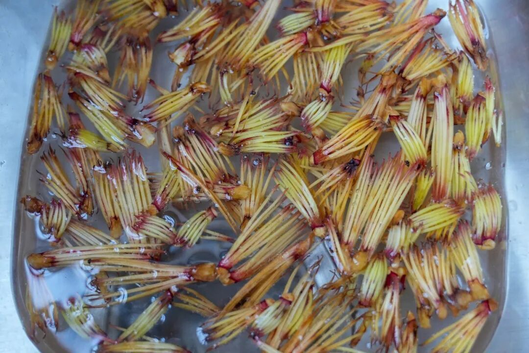 石榴花需彻底去涩:焯水后清水浸泡1—2 天,期间换水,口感才脆嫩无苦