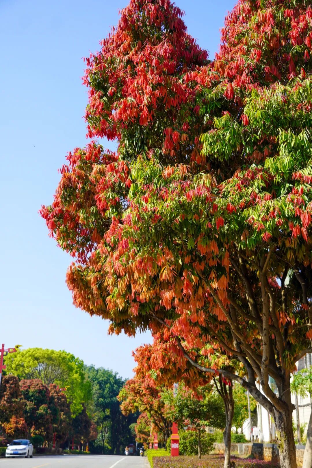 走在园林北路,一排排铁力树整齐伫立,塔形树冠连成一片绯红云霞。