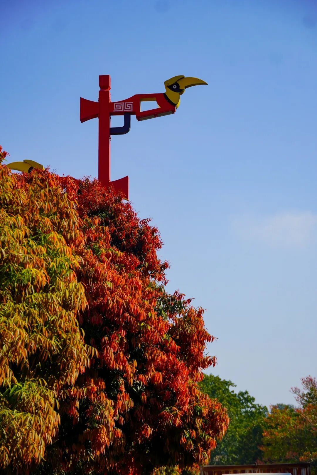 阳光穿过枝叶,光影斑驳落在路面,风一吹,绯红轻晃,治愈又治愈。