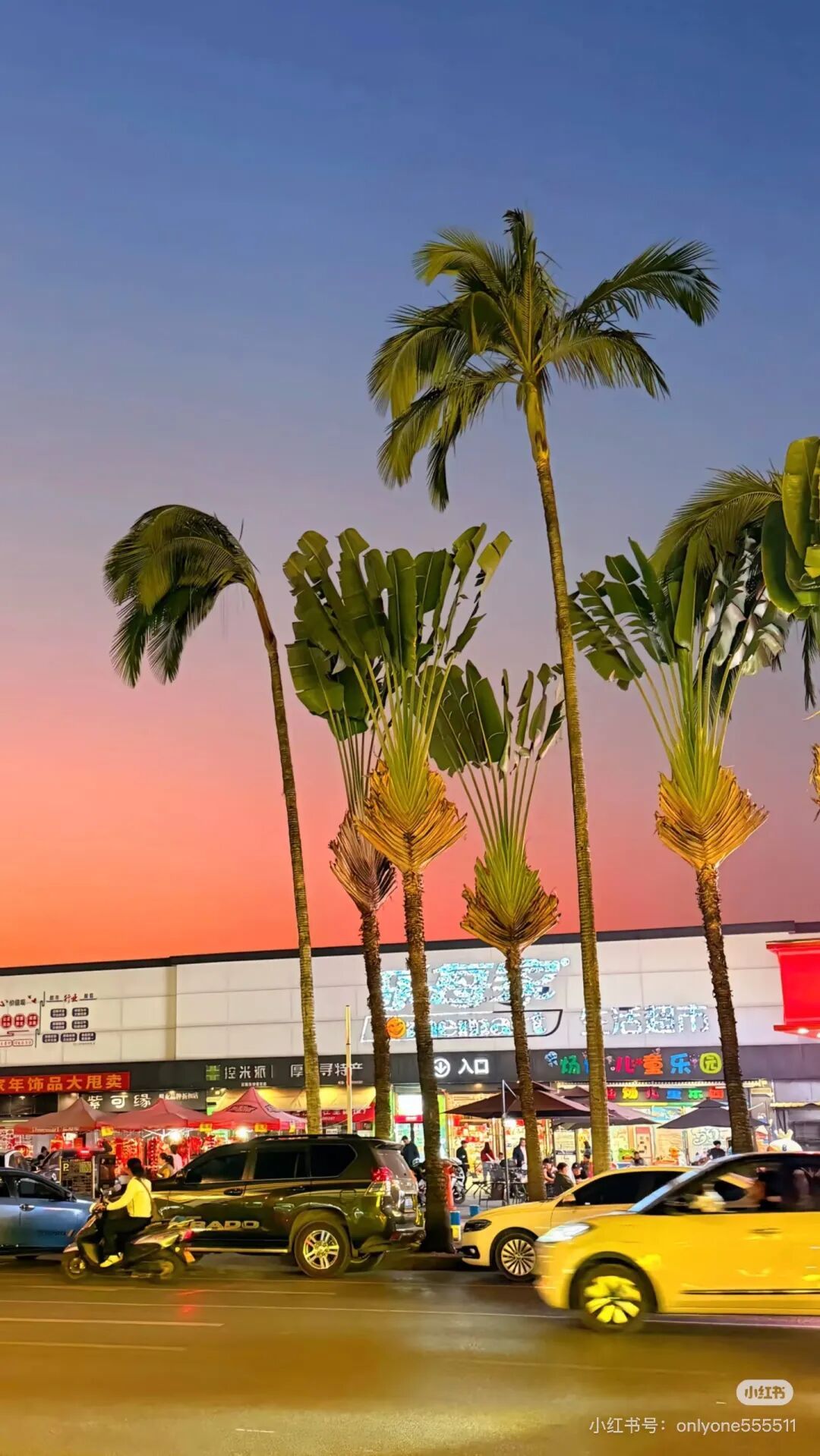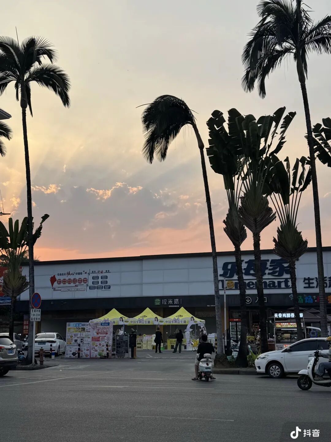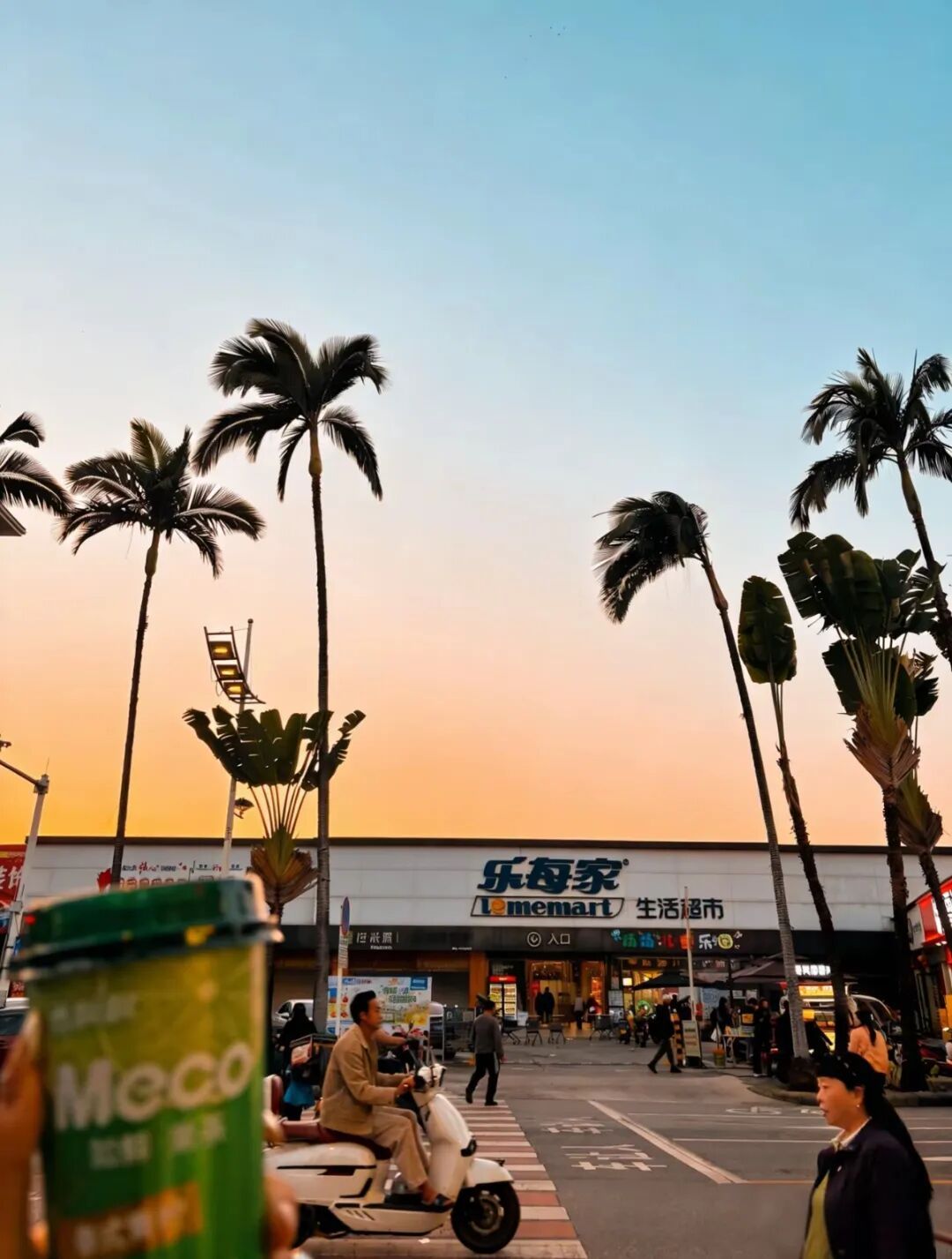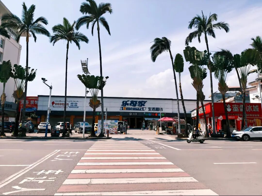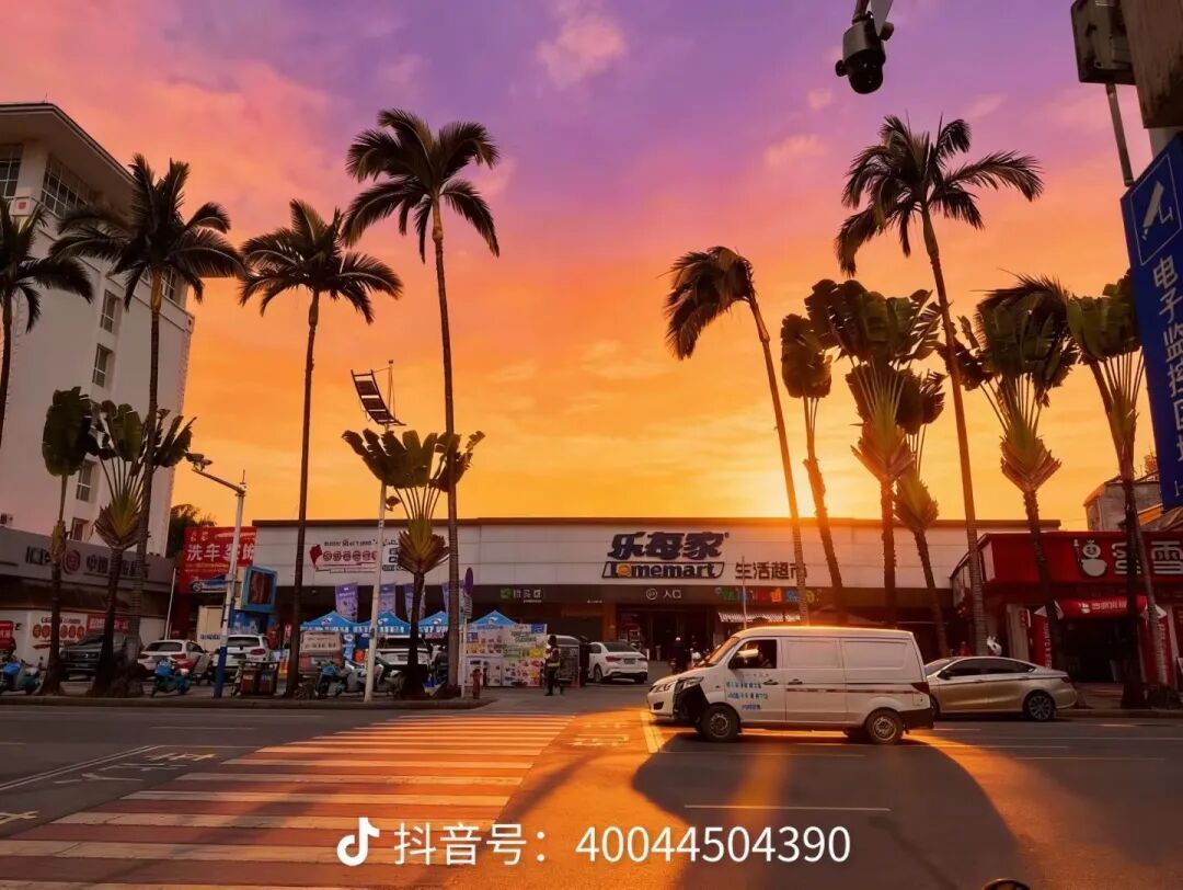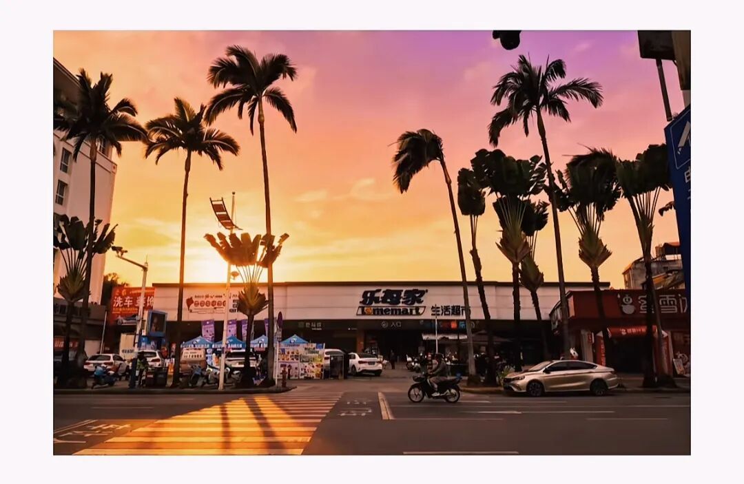 超市门口,一排排高大的树木笔直延伸,搭配澄澈蓝天与暖调晚霞,随手一拍就是美式复古街拍大片,被网友戏称“芒市分州”。傍晚时分,夕阳将天空晕染成橘粉渐变,树木随风摇曳,斑马线、小电驴与市井店铺交织,既有加州的慵懒松弛感,又藏着边境小城独有的烟火气。