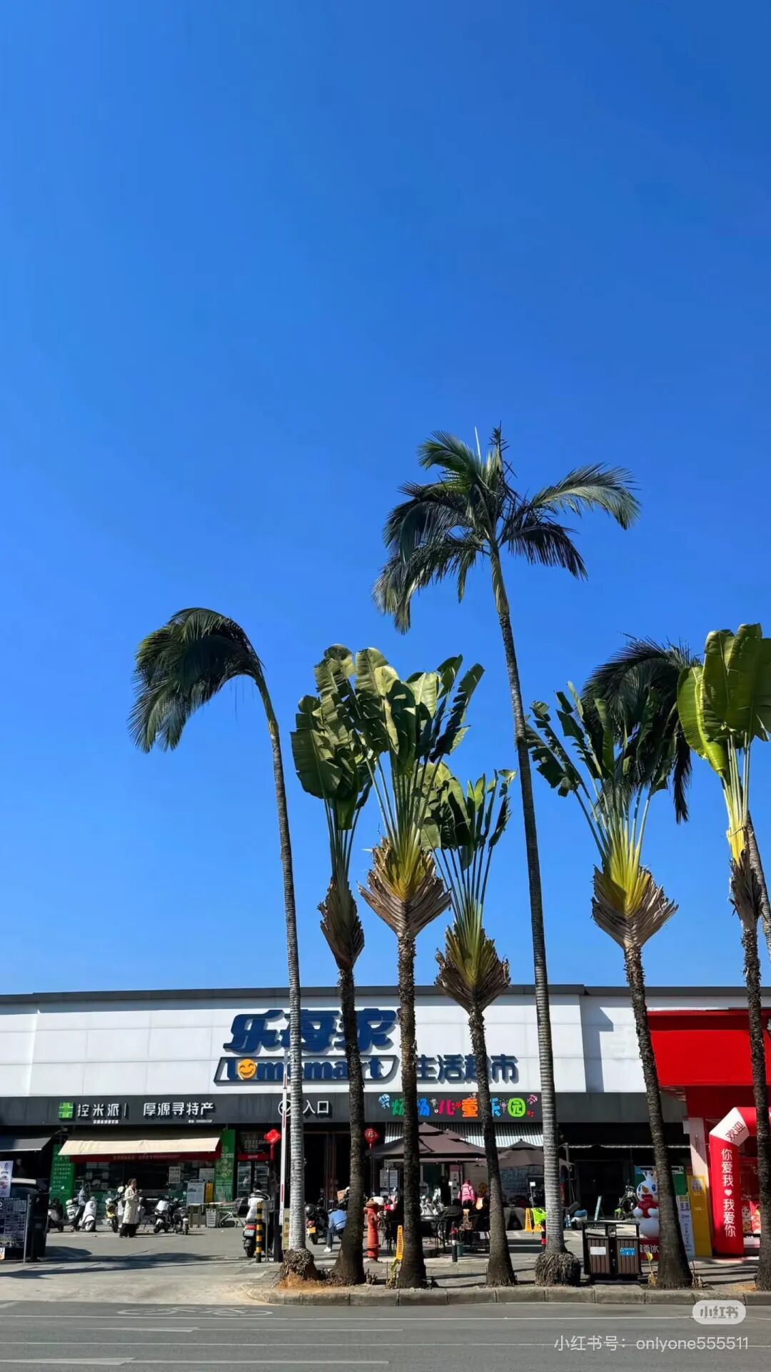 芒市团结大街乐每家超市门口的槟榔树与旅人蕉