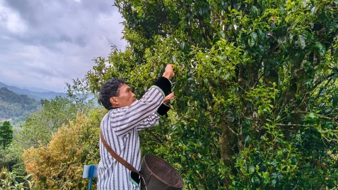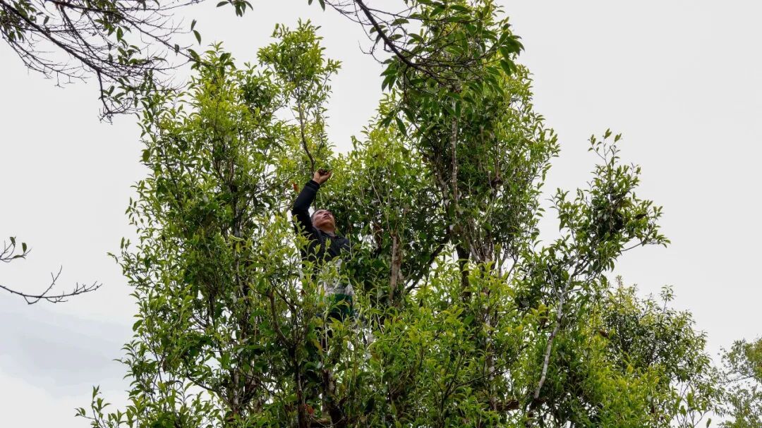 春山沐新露,素手采芳烟。采茶是指尖的艺术,更是人与春天的温柔相逢。春芽初绽贵如金,新茶初烹香若兰,道出了春茶的珍稀与难得。天刚破晓,苏典傈僳族乡茅草村木龙河的茶农便背着竹篓,踏着晨雾步入茶山。这里的古茶树高大挺拔,高则十数米,低则五六米,需搭起竹木架子,方可采摘。攀爬虽显粗犷,采摘却极尽细腻,指尖轻捻,只取单芽、一芽一叶或一芽二叶,留住春日最鲜嫩的本味。
