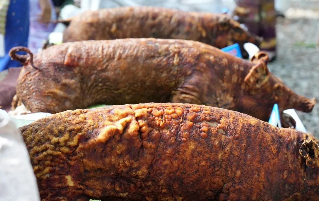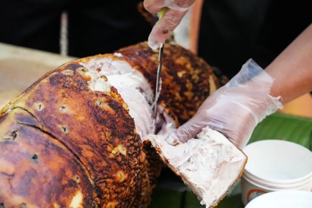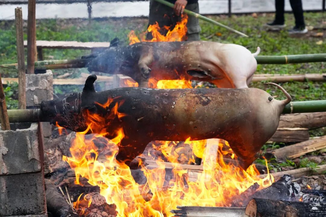 赛场一侧,火烧猪现场实操烧制展示同步开展,5头80斤左右的生猪从烧制开始全程呈现,烧制师傅手法娴熟,翻烤、刷料有条不紊,完整还原盈江火烧猪的传统制作流程,让现场观众直观感受这一特色美食的制作技艺,成为赛场旁一道独具韵味的风景。
