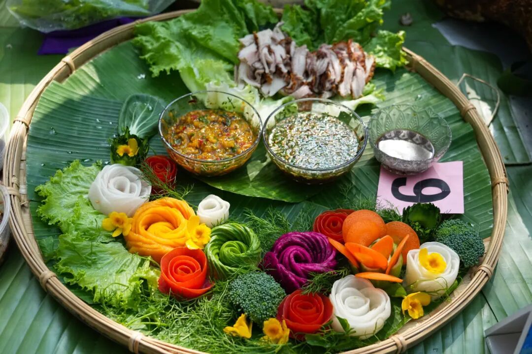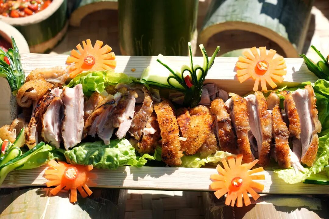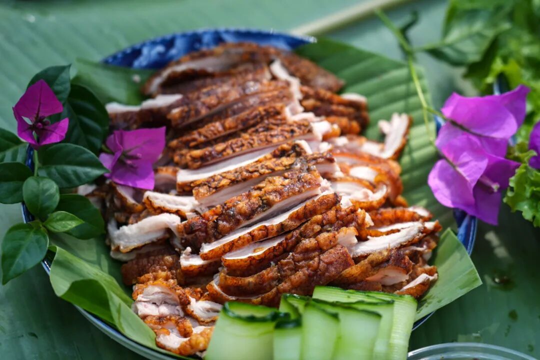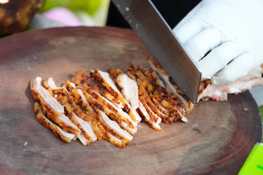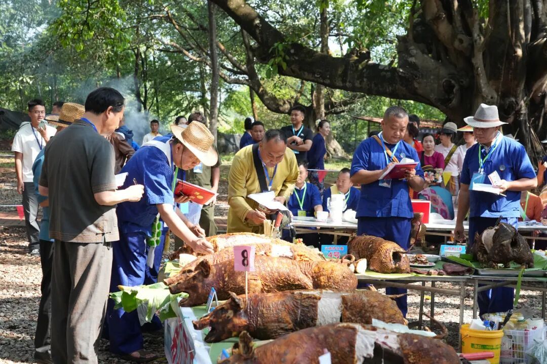 评比环节,由美食专家组成的评委团,依次从作品外形、摆盘设计、现场刀工等方面进行观摩,再通过品鉴口感,从火候掌控、肉质鲜嫩度、特色蘸料等维度综合评分,并采取去掉最高分、最低分取平均分的方式,确保评审公平公正。金黄的猪皮、鲜嫩多汁的肉质,搭配地道傣味蘸水,浓郁鲜香弥漫整个赛场。