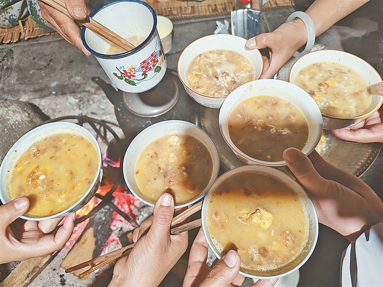 冬春时节,走进盈江苏典傈僳族乡的村寨,总能看见这样一幅暖融融的画面:三五亲友围坐火塘边,柴火“噼啪”作响,主人正忙着烹制傈僳族特色美食——牛油煮白酒鸡蛋。