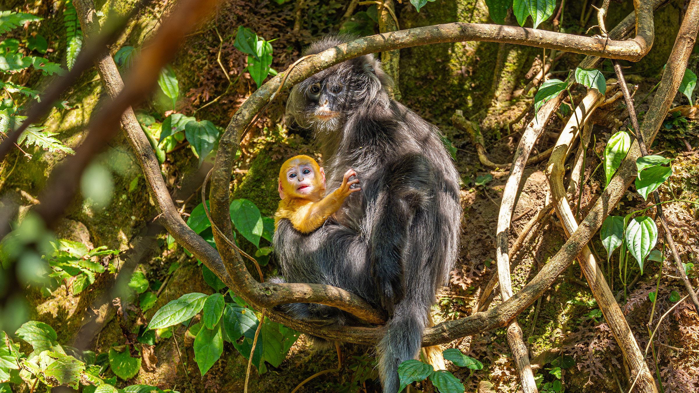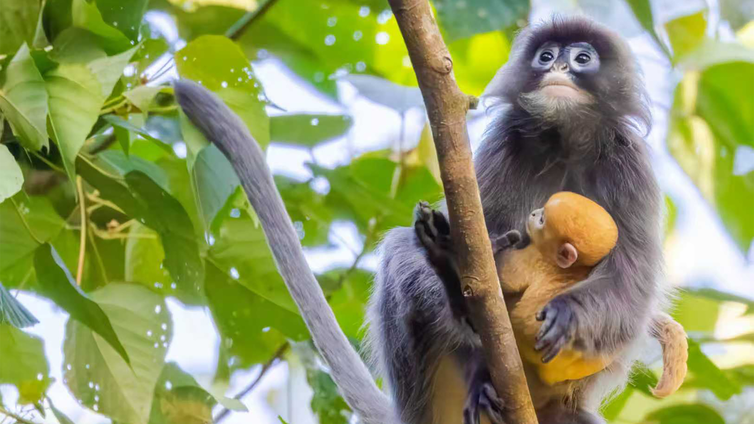 新年伊始,云南省德宏傣族景颇族自治州芒市轩岗乡传来令人欣喜的消息:生活在这片区域的国家一级重点保护野生动物中缅灰叶猴开始产崽。经过连续多日观察、蹲守,记者记录到猴群玩耍、觅食和金黄色幼猴依偎在妈妈怀抱里的影像。