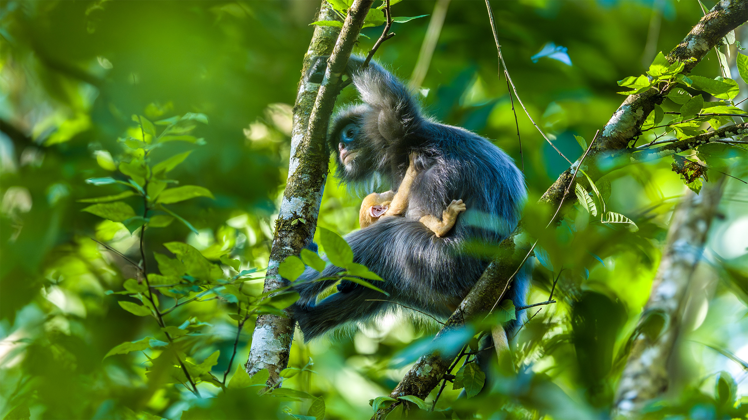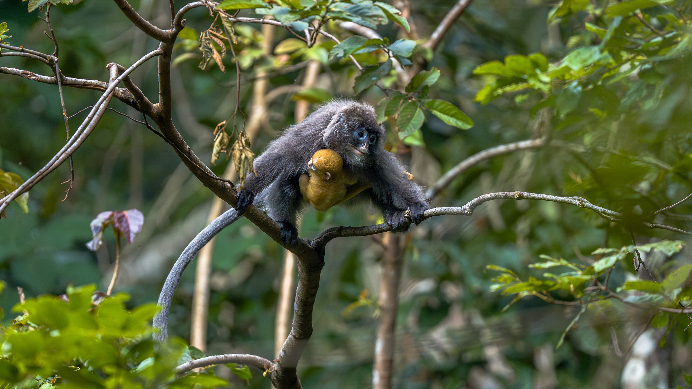 中缅灰叶猴通常在每年1月左右开始生产猴宝宝,它们的幼猴和其他叶猴的幼猴一样,在3个月前全身毛色呈金黄色,非常漂亮。3个月后毛色逐渐变成灰色,因此能看到金色的小猴实属幸运。中缅灰叶猴拥有很长的尾巴,这让它们在林间飞跃时能更好地保持身体平衡。它们大大的眼睛和淡蓝色的眼圈,让它们看起来非常美丽迷人。