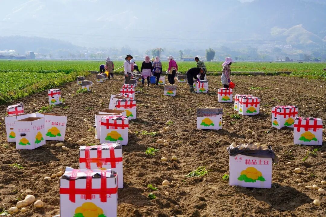 在马铃薯收购站,工人们同样忙得热火朝天,分拣、打包、装车,一箱箱包装整齐的盈江早熟马铃薯整装待发,将跨越千里,在春节前运往全国各地的市场,端上千家万户的餐桌。