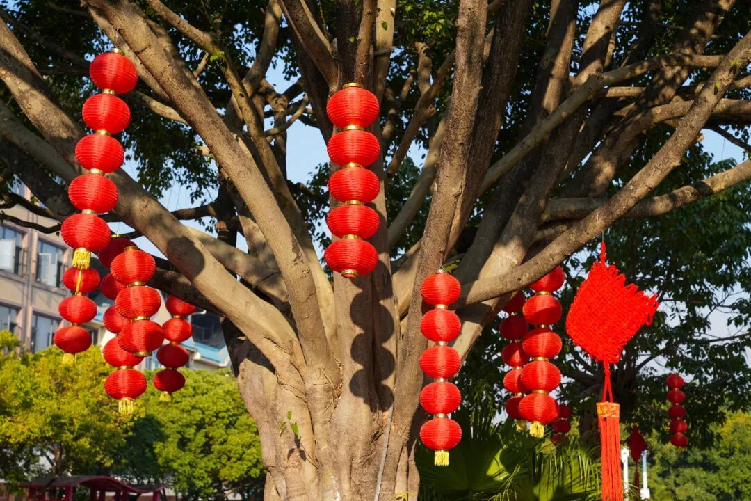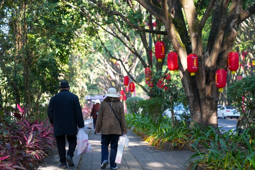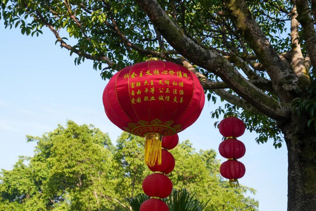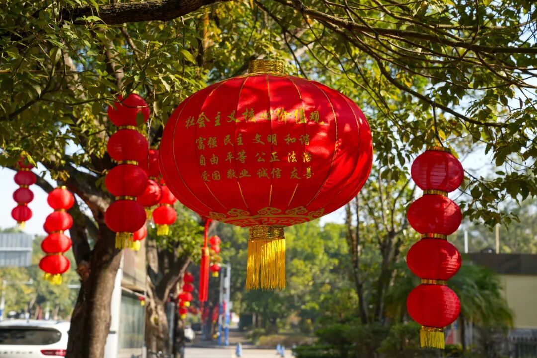 走在章凤城区的大街小巷,一串串红灯笼沿路灯杆、行道树整齐排列,红绸轻垂、灯影摇曳,与蓝天绿树、民族特色建筑相映成趣。