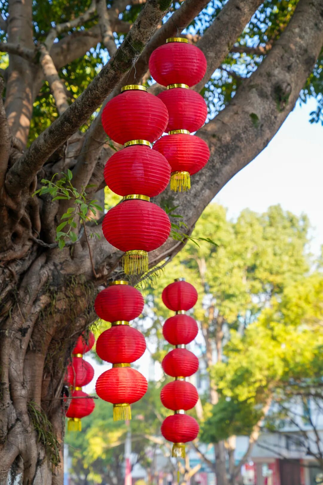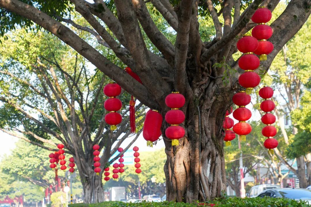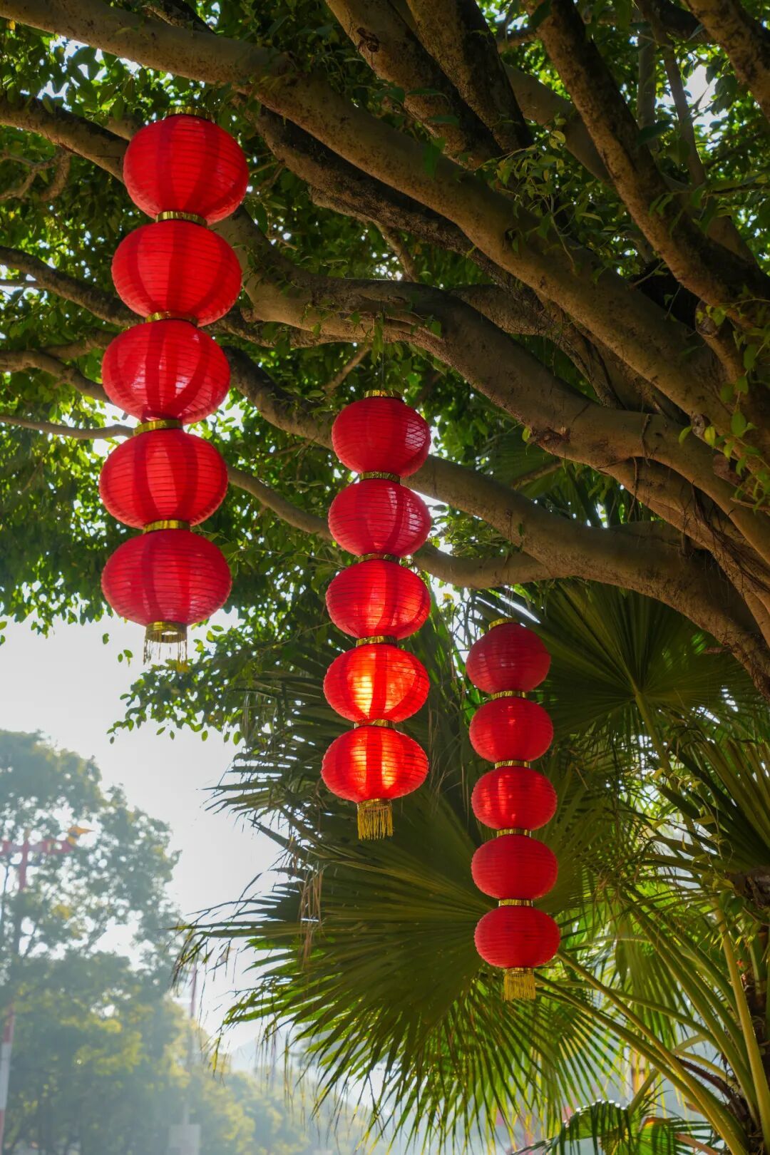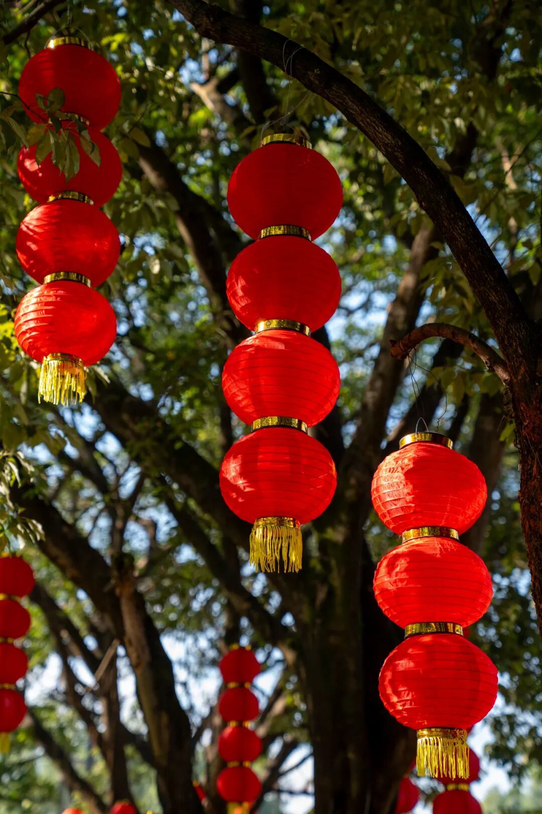 灯笼阵列错落有致,白天红火大气,夜晚暖光流转,勾勒出城市最温柔喜庆的轮廓。