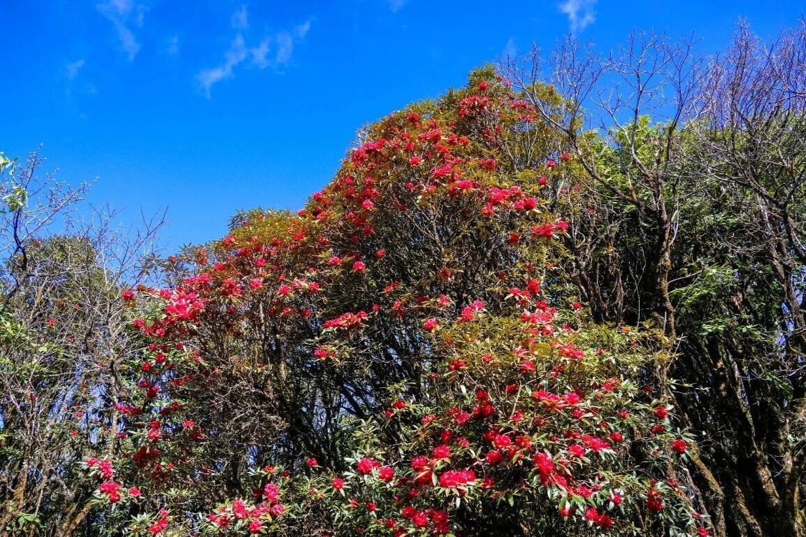 作为云南省八大名花之一,马缨杜鹃的美自带山野间独有的磅礴与赤诚。远远望去,那些傲立在草甸与山林之间的马缨杜鹃树,宛如新娘手中捧着的一束束巨型手捧花。深红的花瓣层层叠叠,在蓝天与远山的映衬下,美得惊心动魄。风过处,花枝轻颤,那是春日里最温柔的呢喃。