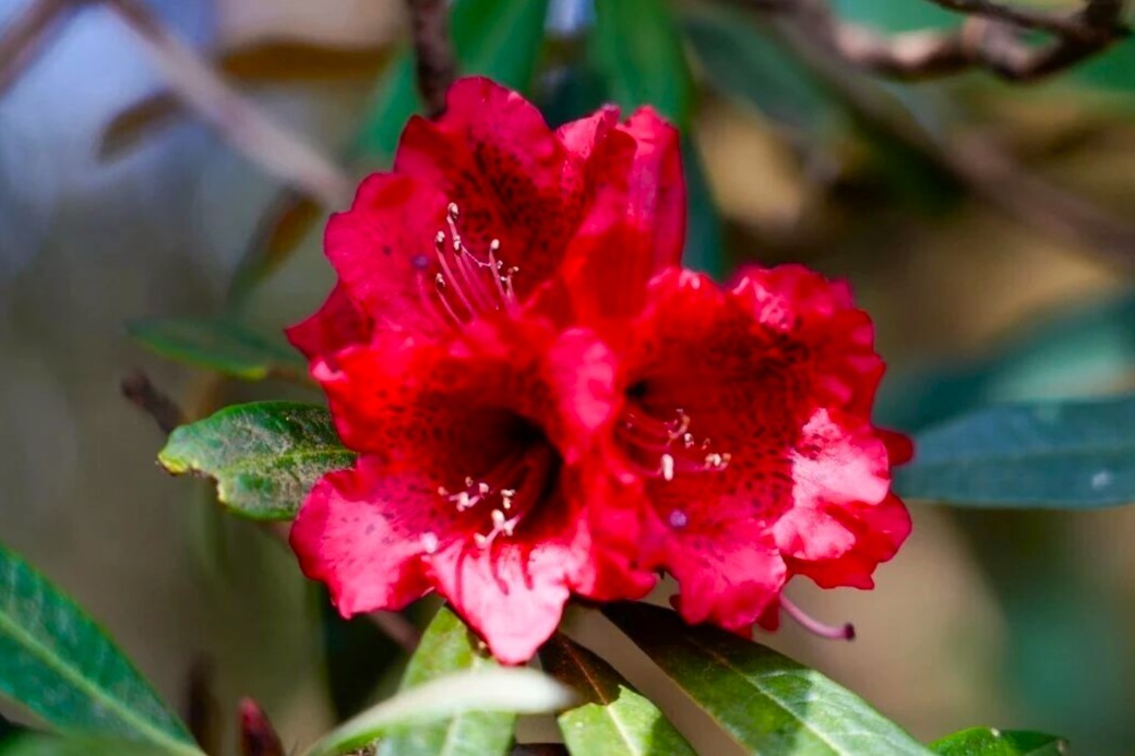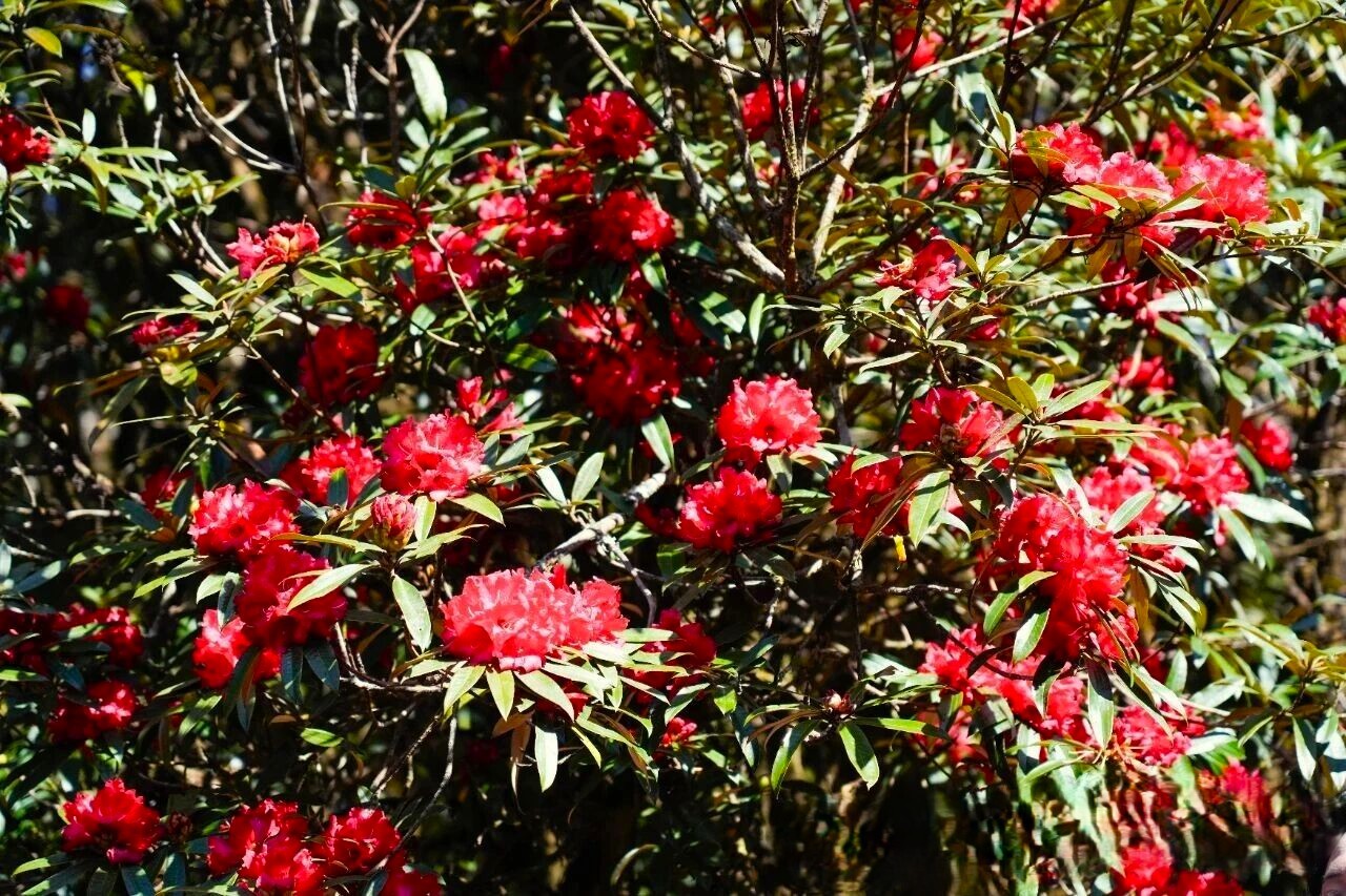 当你轻轻走近,便能真切地领略到,每一朵马缨杜鹃都宛如一件被岁月精心雕琢的艺术品。钟形的花冠肉质饱满,艳红的花瓣上点缀着细密的深色斑纹,花蕊纤细如丝,在阳光下泛着微光。它们或三五成簇,或满树绽放,将灰褐色的枝干装点得热闹非凡,宛如一场盛大的春日狂欢。